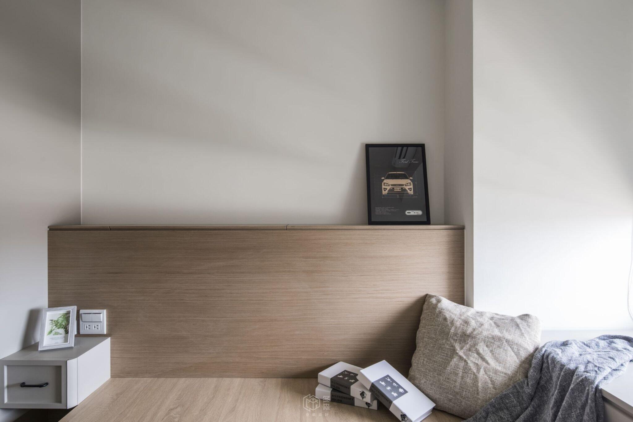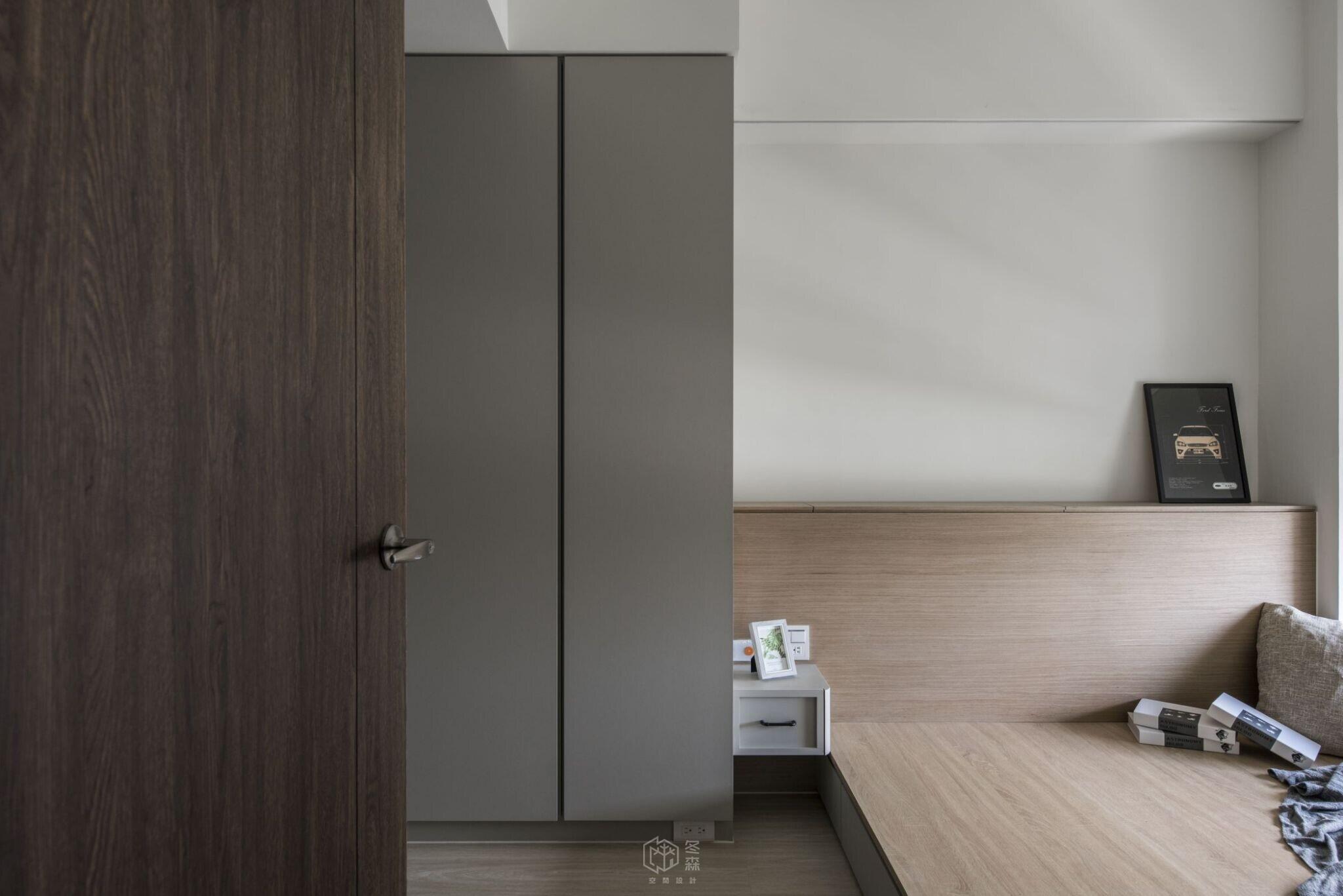 臥室空間以淺灰漆面搭配木質調,配置空間機能與美感營造,在一派和諧的色彩中,打造內斂而富層次的質感氛圍,每一吋空間皆回應屋主對高品質生活的嚮往。