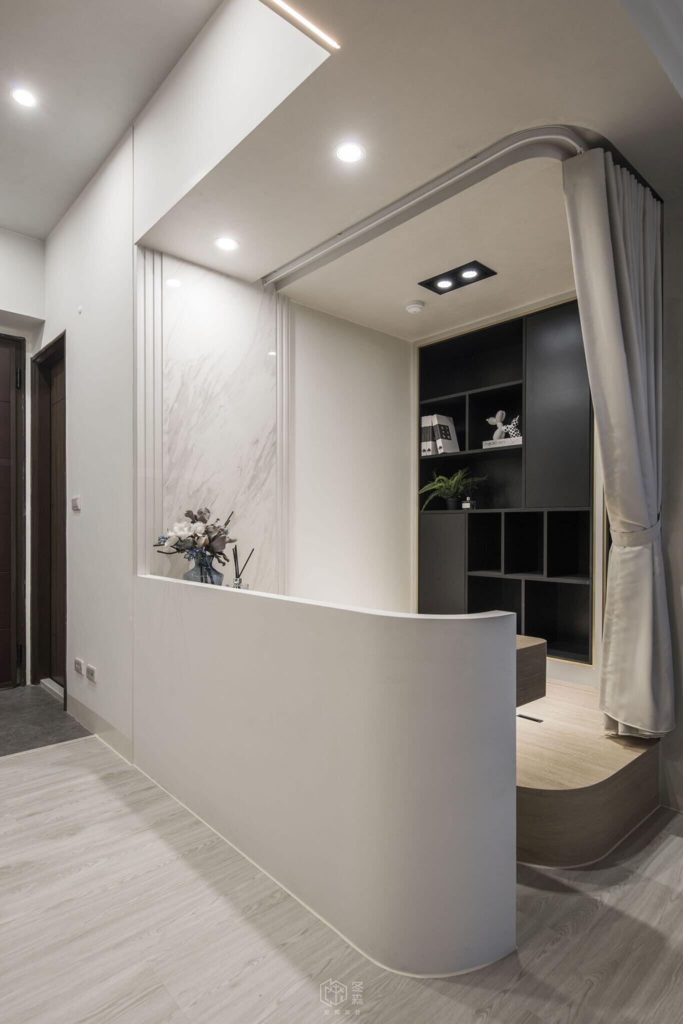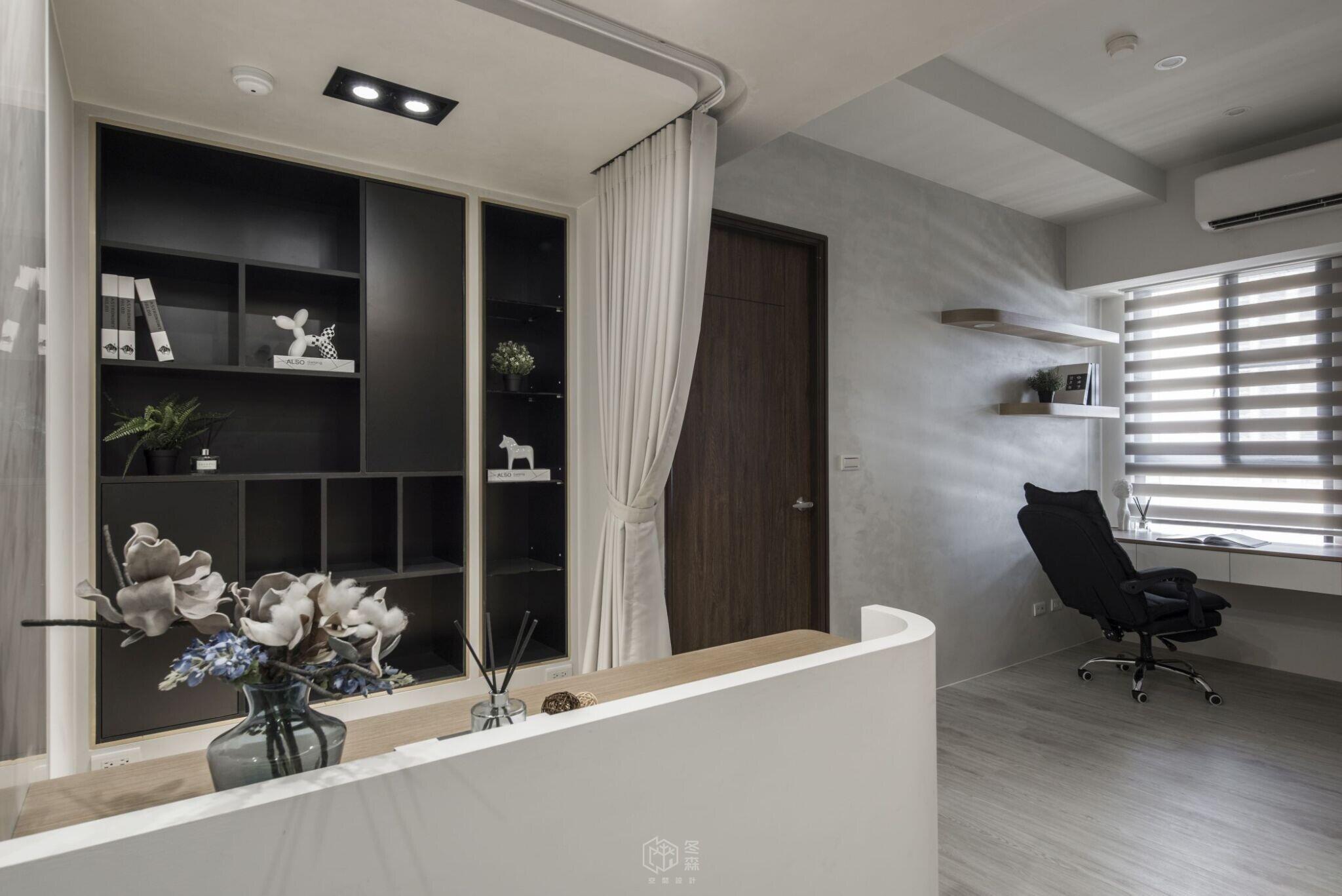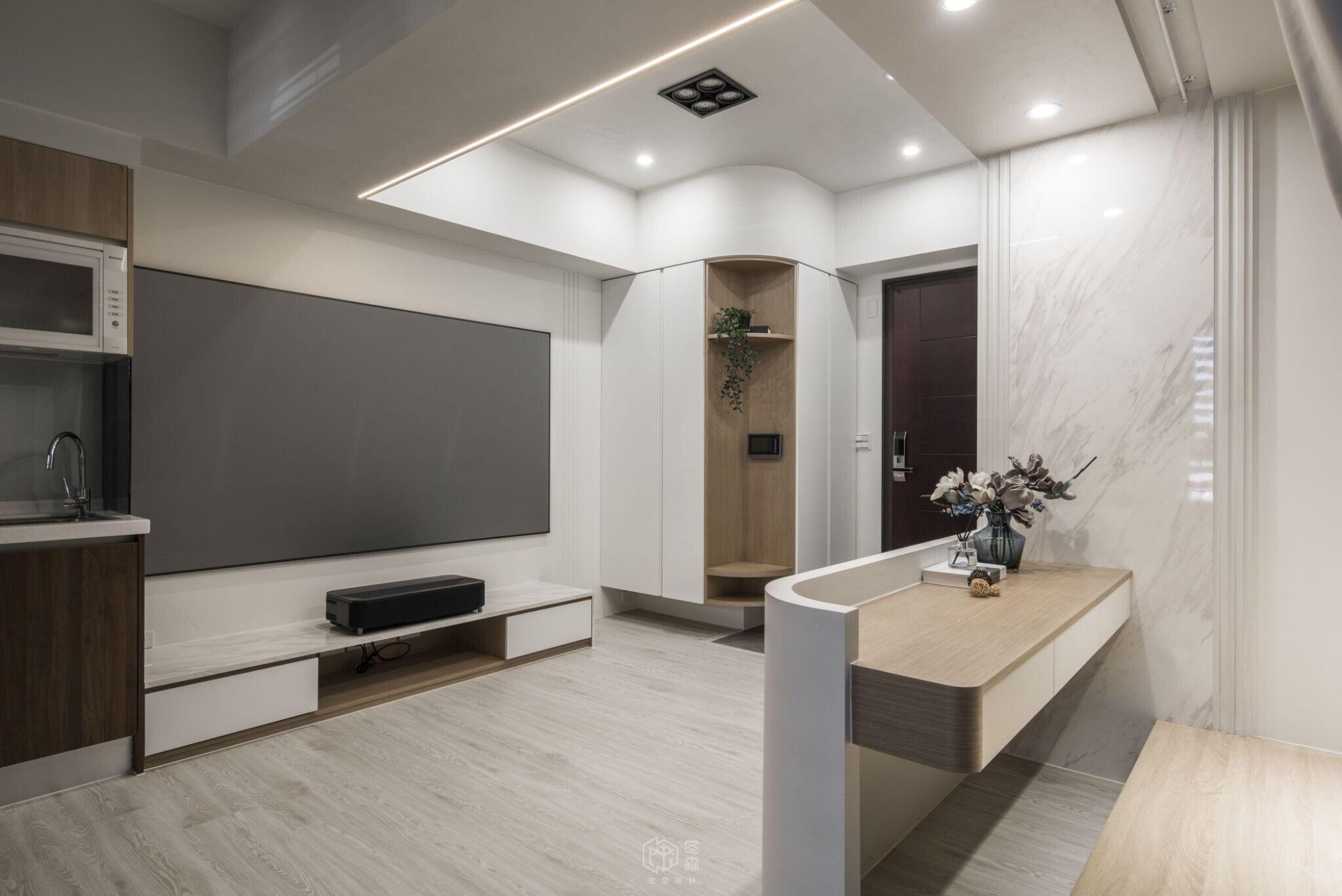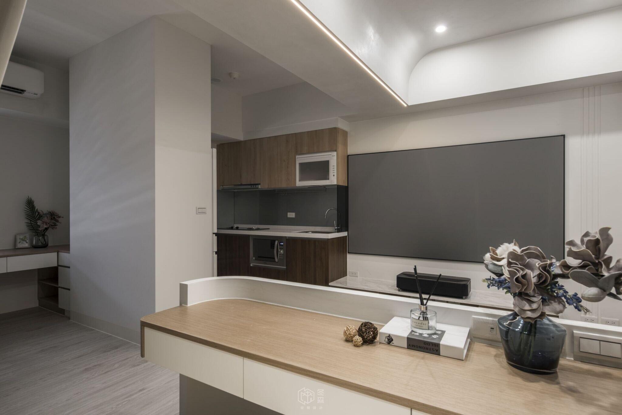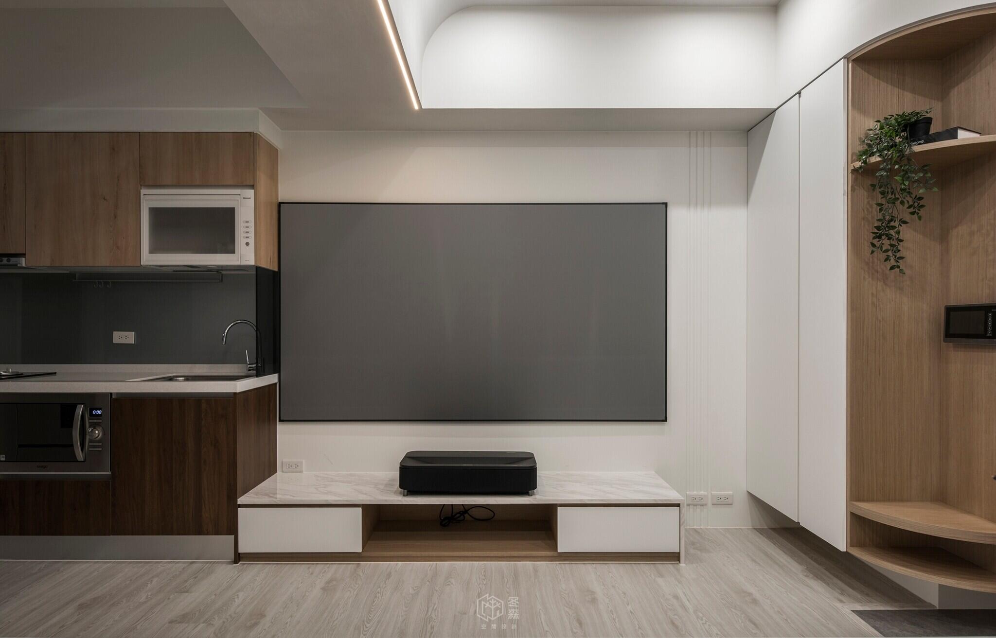 玄關沿牆面依序規劃吊放衣物、鞋櫃及穿鞋椅機能,跳脫制式的傳統客廳陳設,捨去了3C電視的存在,改為彈性展開的投影布幕,去除既定的沙發,採用半高牆架高地板,規劃工作、閱讀、休息小憩的空間。天花板的高低巧思,模糊了空間之間的界線,以光線與動線引導場域劃分,兼顧美感與實用,實現舒適與效率並存的居住體驗。