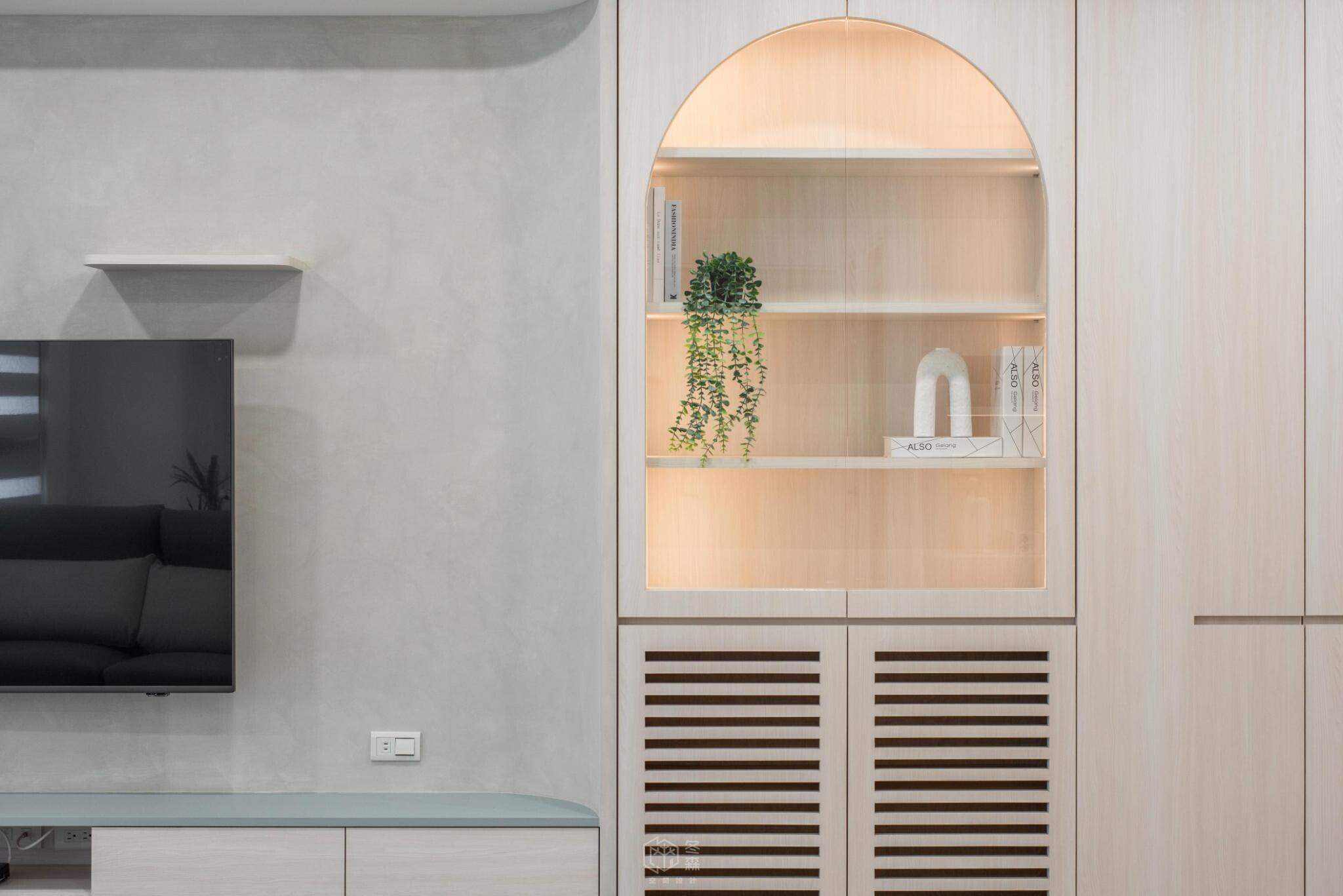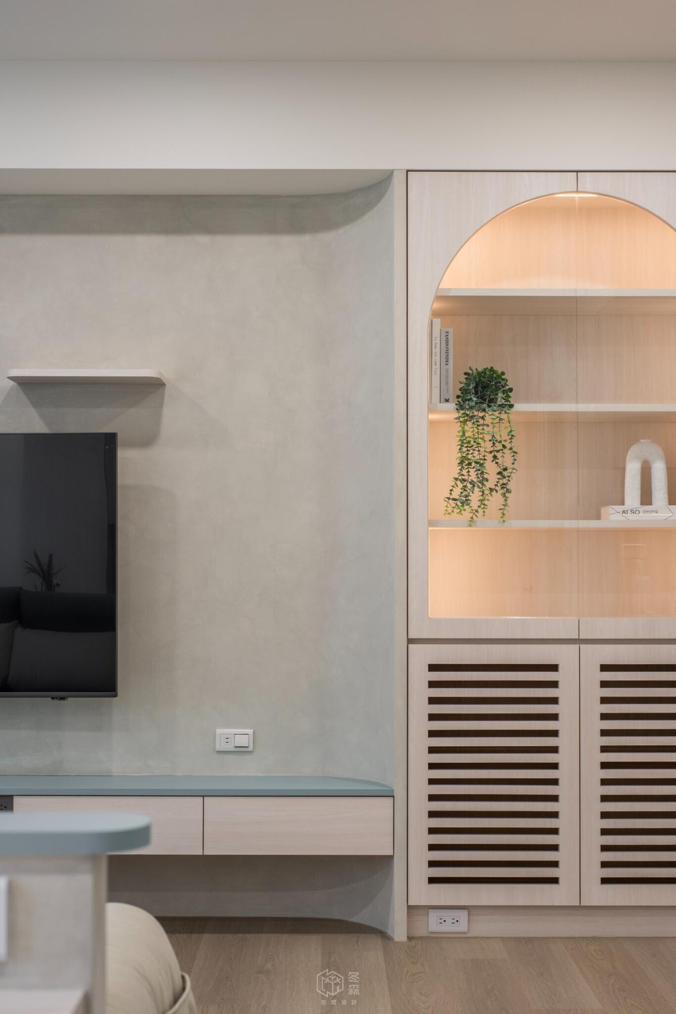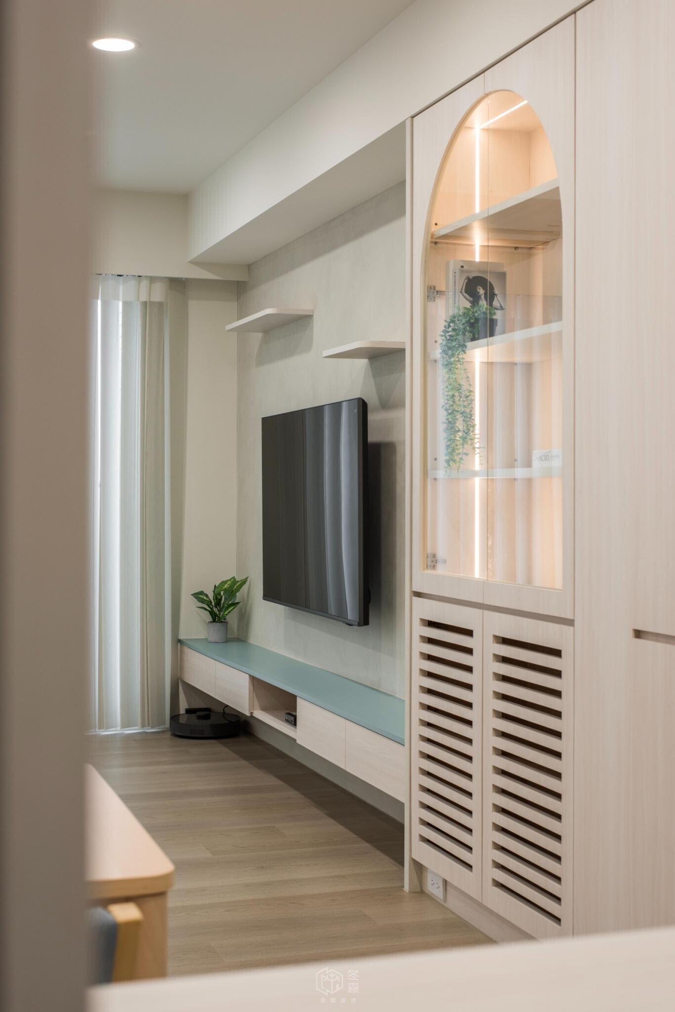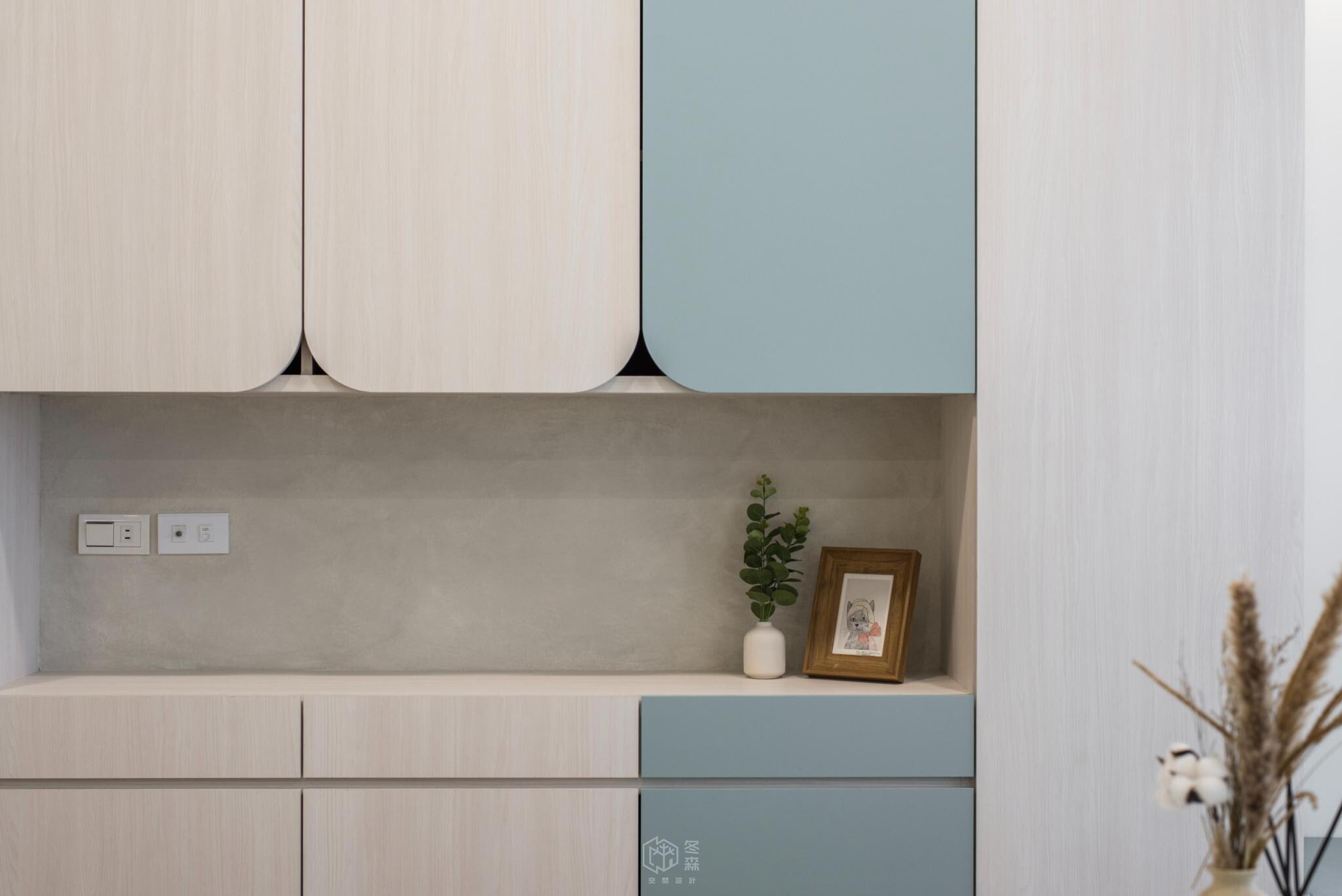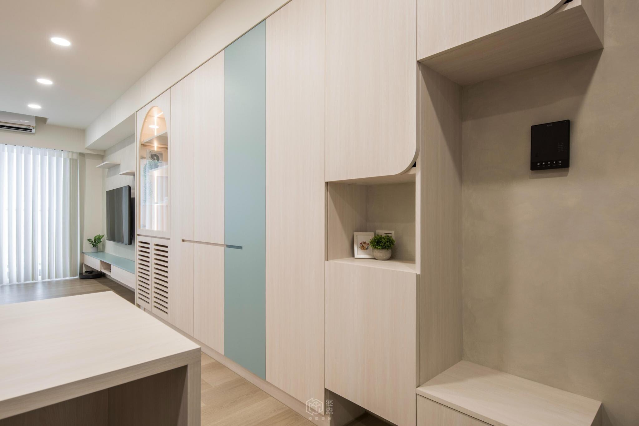 玄關處不希望帶來壓迫感,因此將電器櫃設計為矮櫃形式,巧妙地兼具收納與機能,並可作為小中島使用,為日常生活增添一點靈活的彈性。
