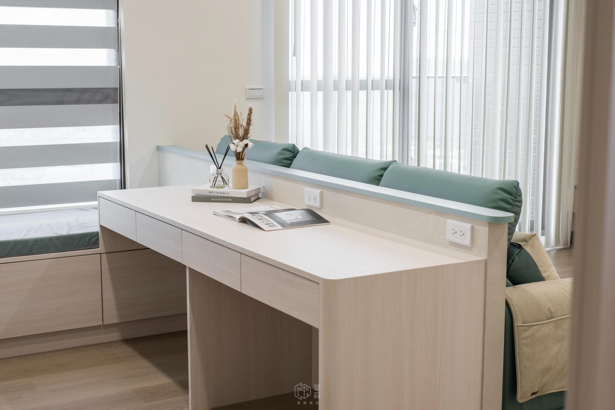 為了滿足親子共讀的習慣,我們在公共區域配置了大書桌與臥榻,創造出一個能閱讀、對話、靜心的共享空間。這裡不只是一個角落,更是家人間共同成長與交流的舞台。