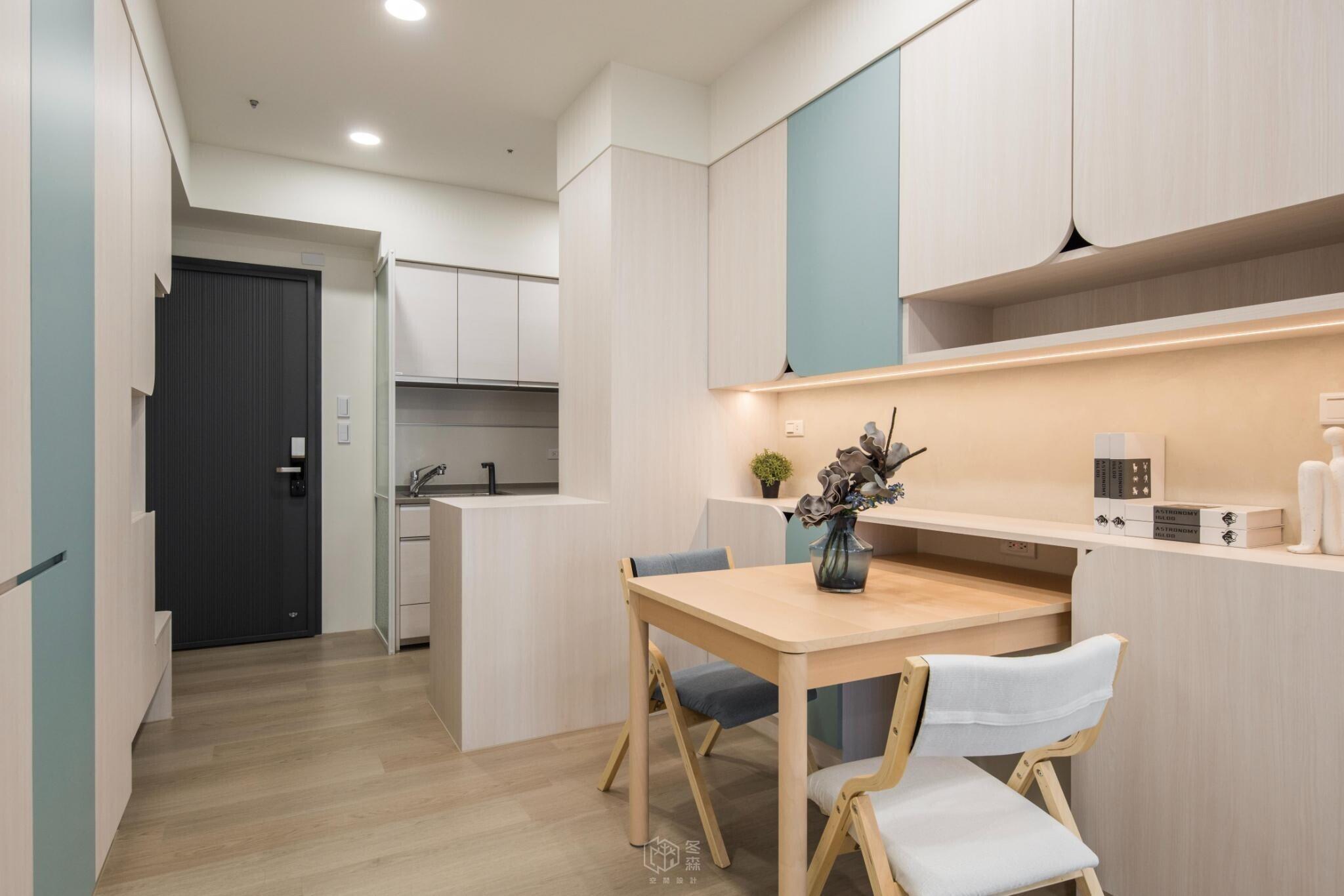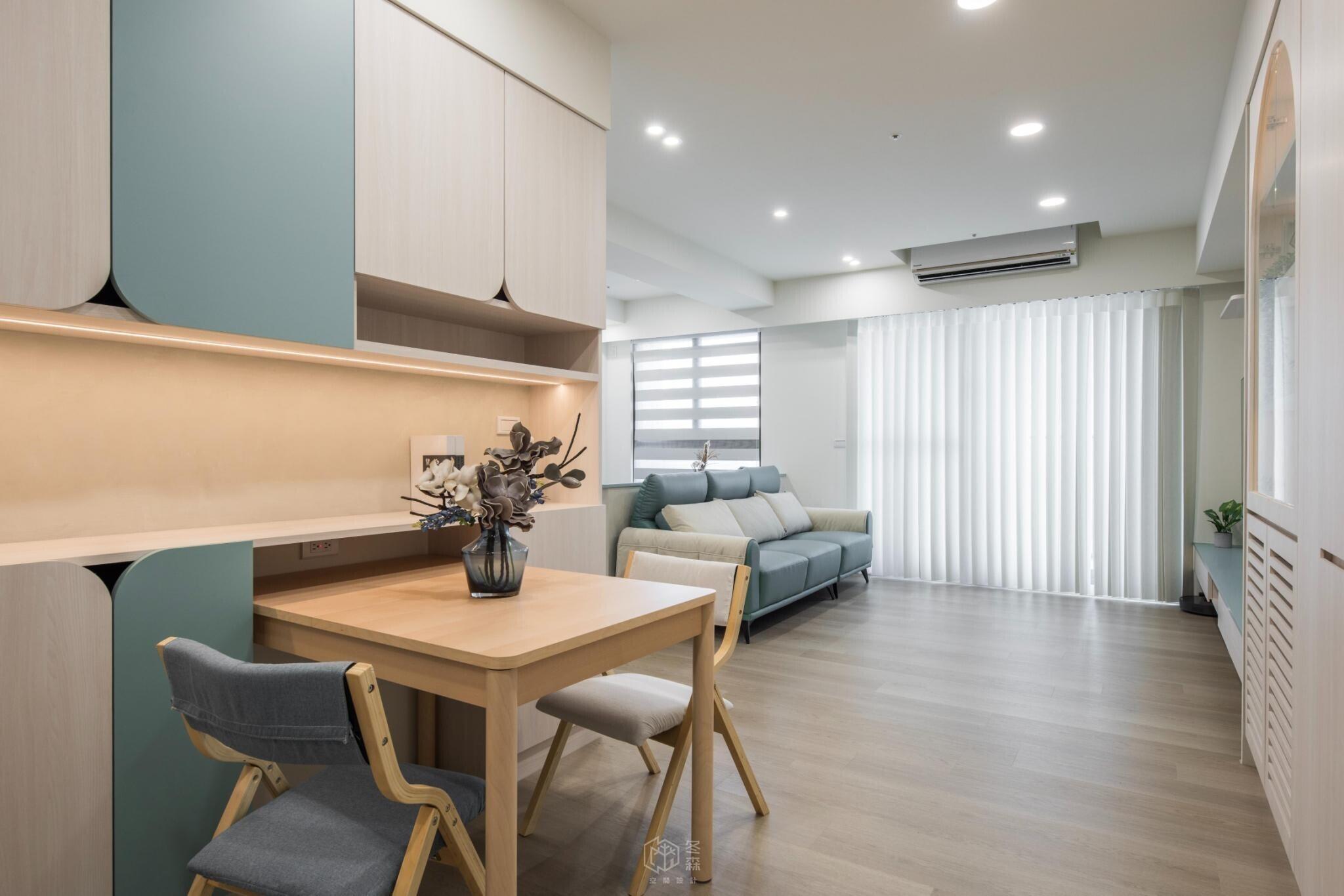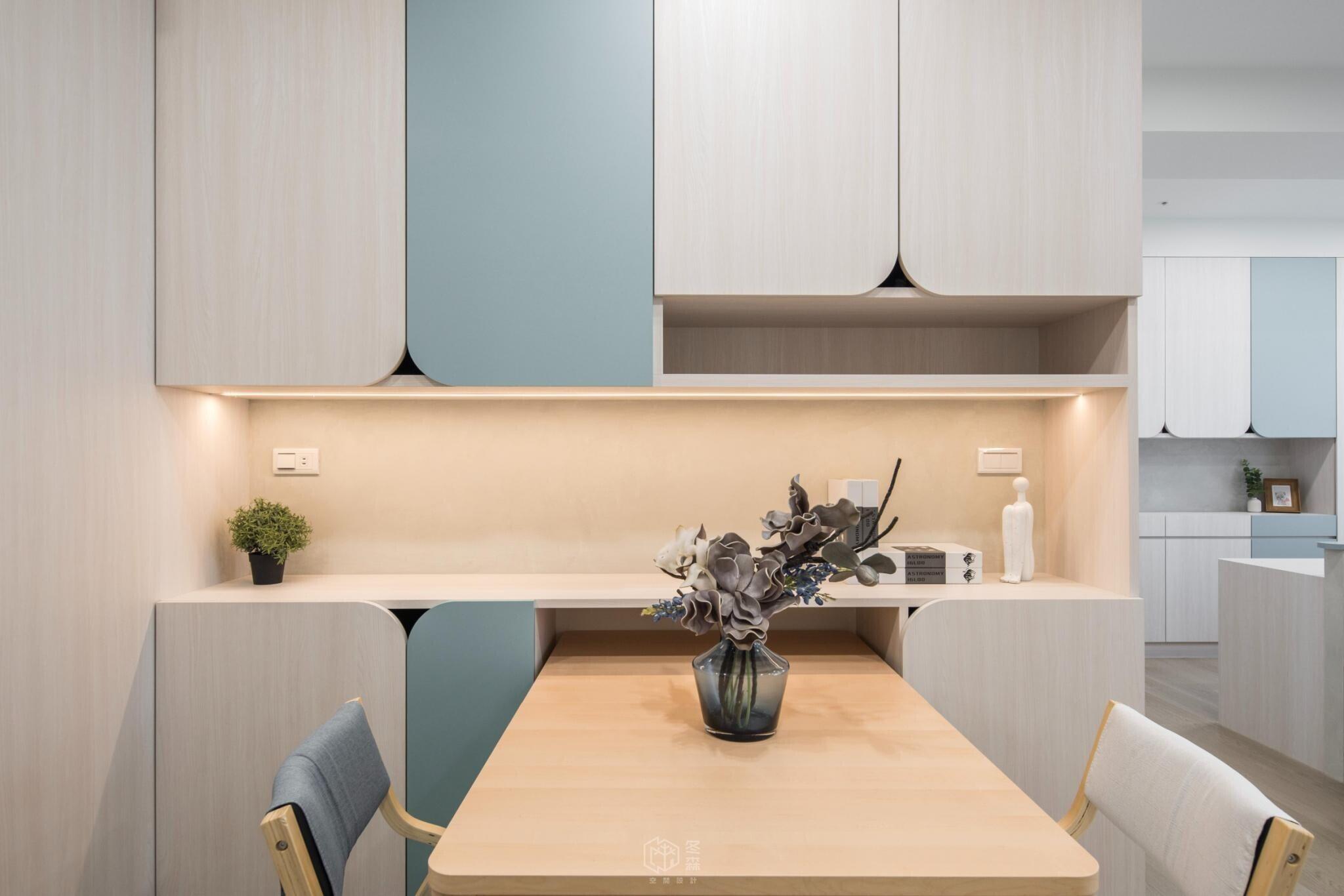 設計不只是形式,而是將日常過得更美好的方法。業主精心挑選藍色沙發與餐椅,延續空間的主調;進門處的矮櫃中島,則讓機能與動線更靈活。這些細節,正是家的儀式感所在。