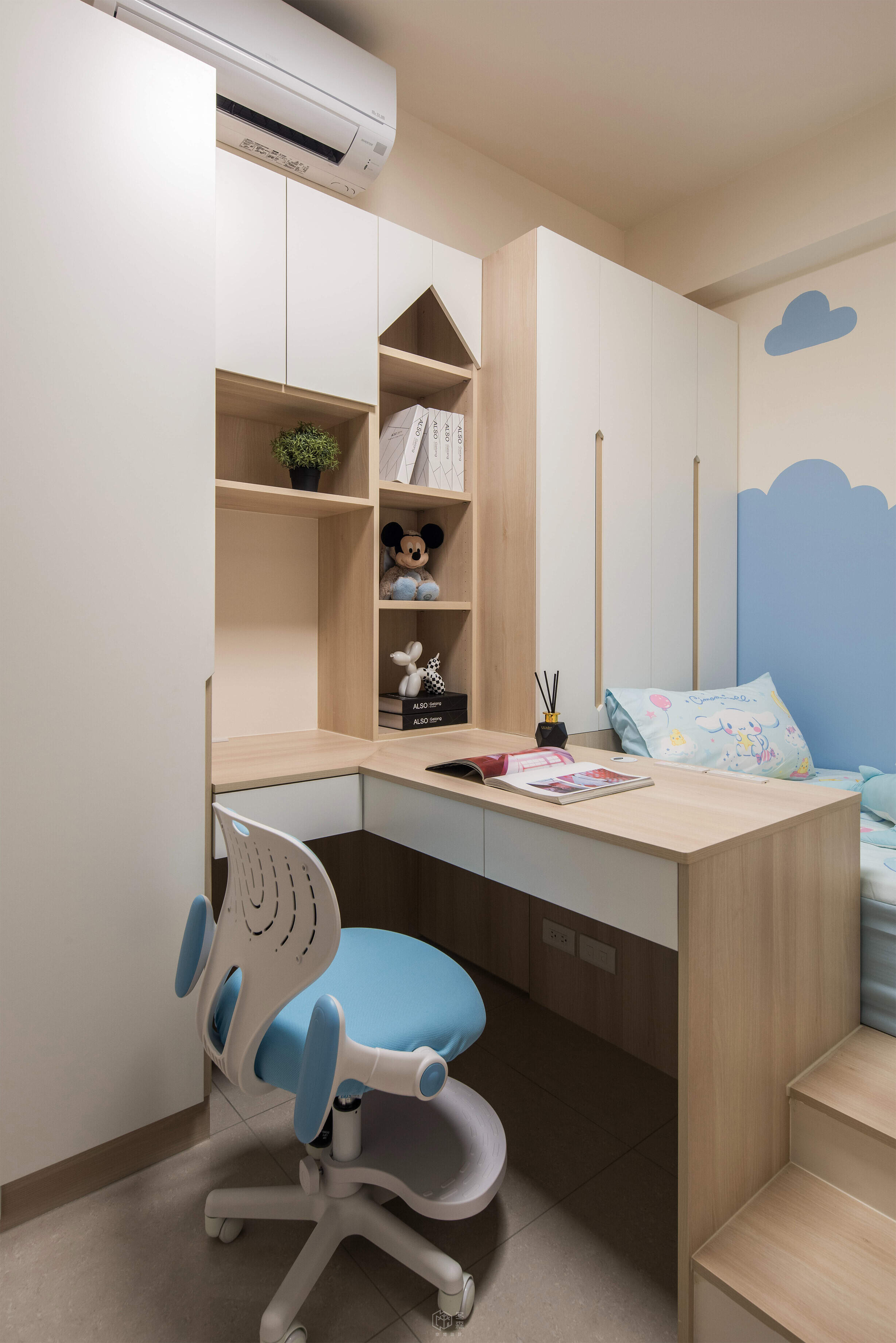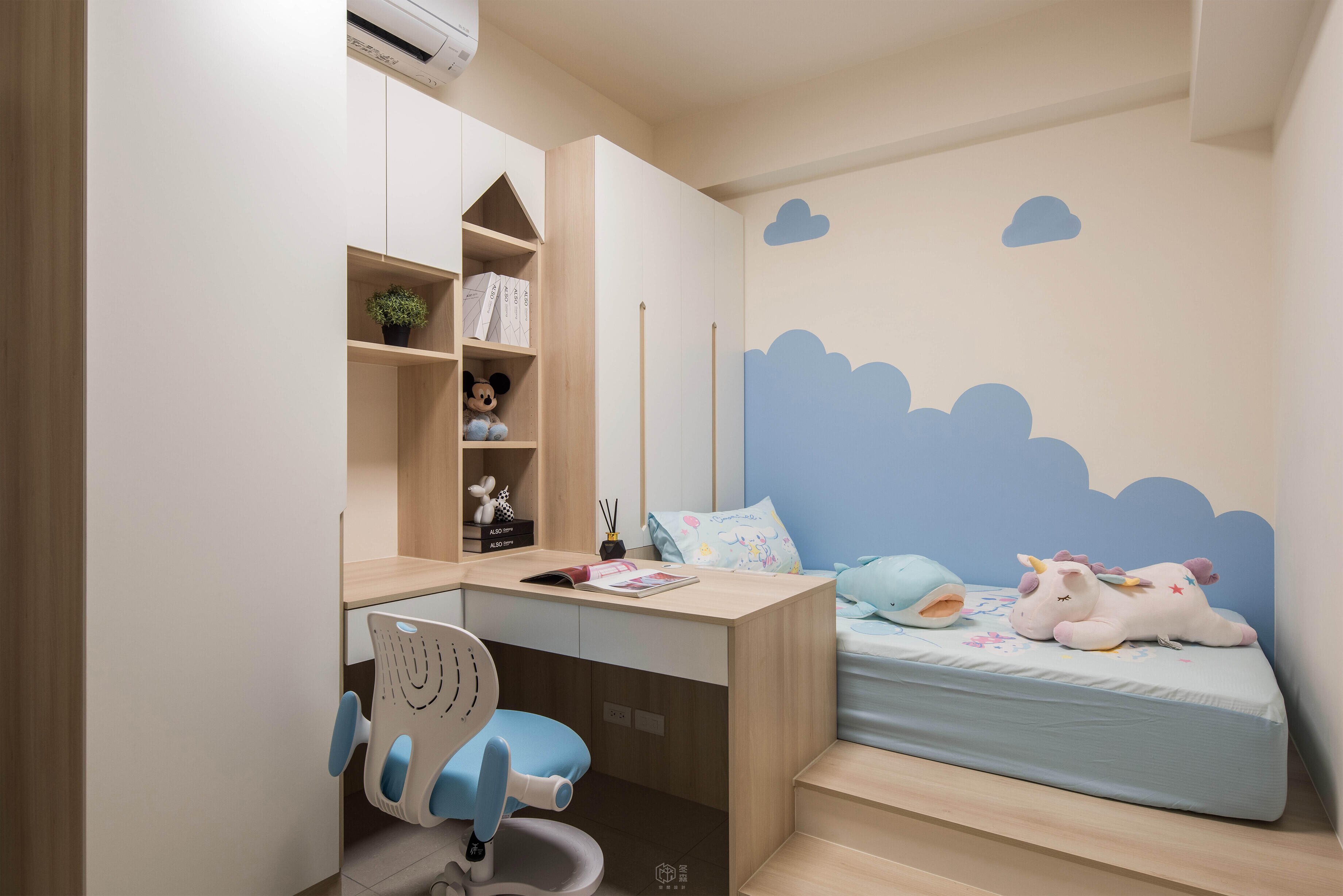 採用木質調色系打造溫和一致的整合式櫃體,兒童房以圓角、低平台結合書桌設計,節省空間同時兼顧安全,藍色雲朵造型牆面,打造如夢中場景般的孩童房,讓美感過濾掉日常的凌亂
