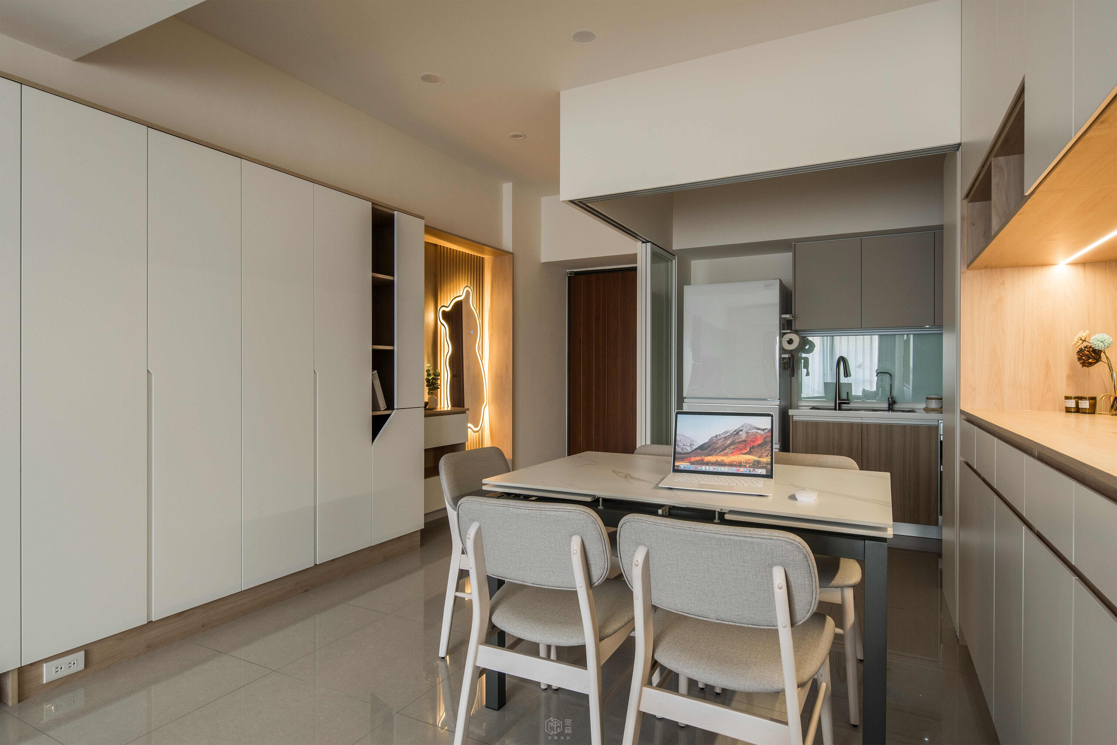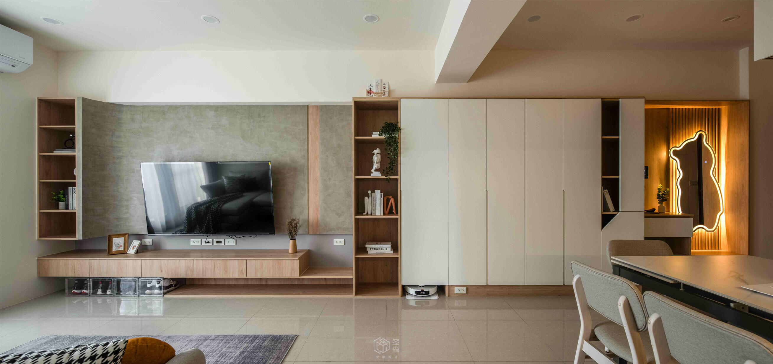 近年來的新成屋委託改造都是為了因應生活上需求的改變然而在這空間中如何同時做到收納、照明、採光、以及適合親子的溫馨環境則需要透過經驗豐富且細心的設計師打造出滿足屋主偏好與需求的居住空間∣∣∣本次設計重點 :∣∣∣收納最大化:大量整合式櫃體讓整體空間更俐落實用間接照明:玄關區塊的小熊鏡子與燈光設計 , 有效提升空間層次與溫暖採光兒童房 : 以圓角、低平台、藍色雲朵造型牆面 , 打造輕鬆可愛的空間 , 營造童趣氛圍同時兼顧安全,平台床結合書桌設計能更有效的利用空間