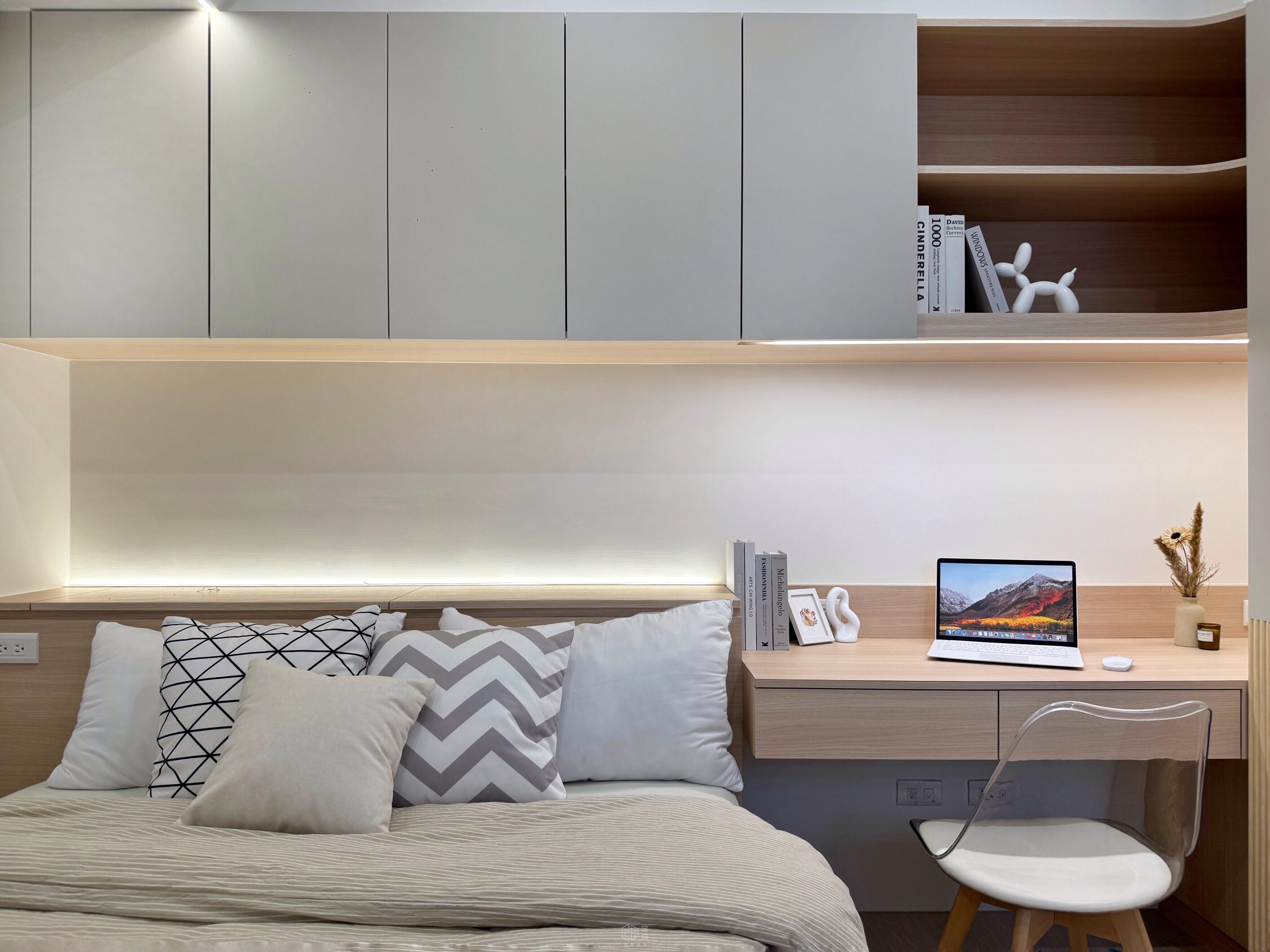 我們採用簡約的配色與設計 , 做了斜板造型+燈條修飾弱化大樑存在感