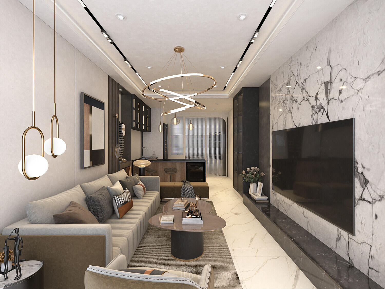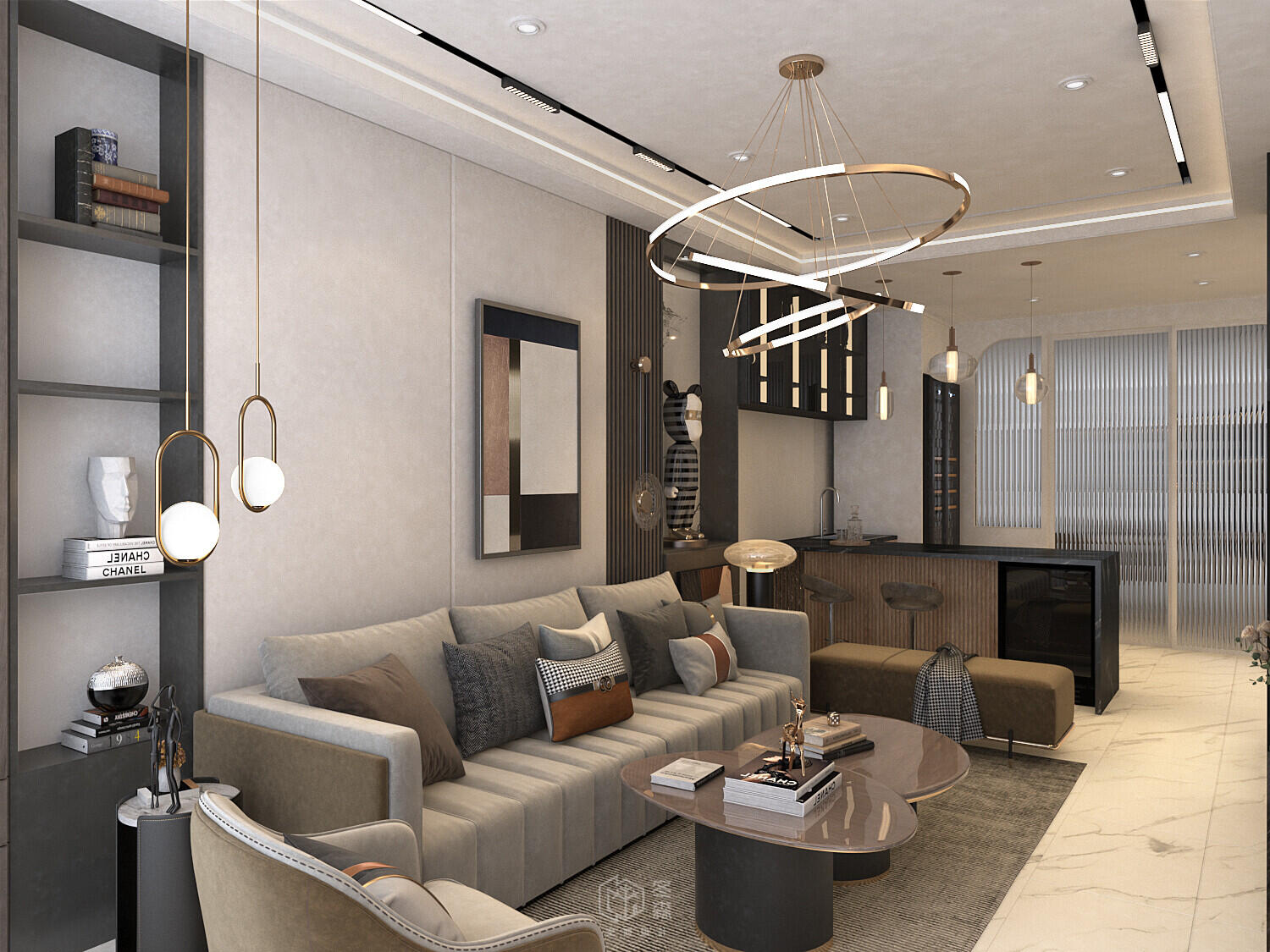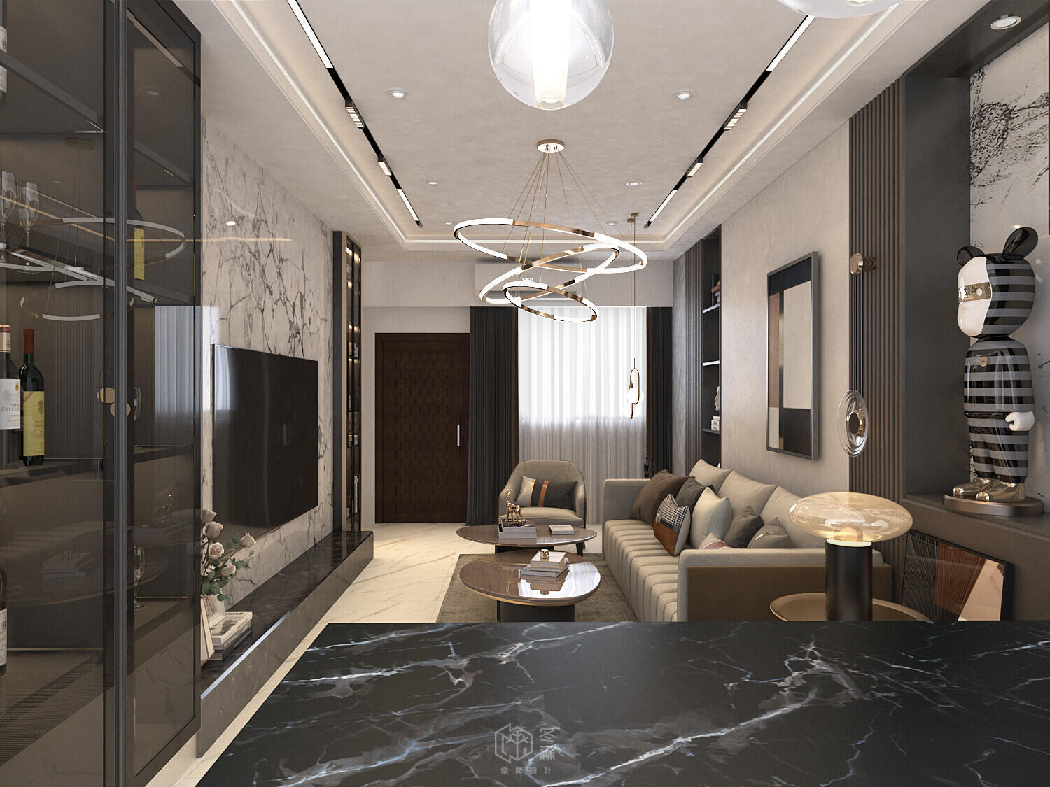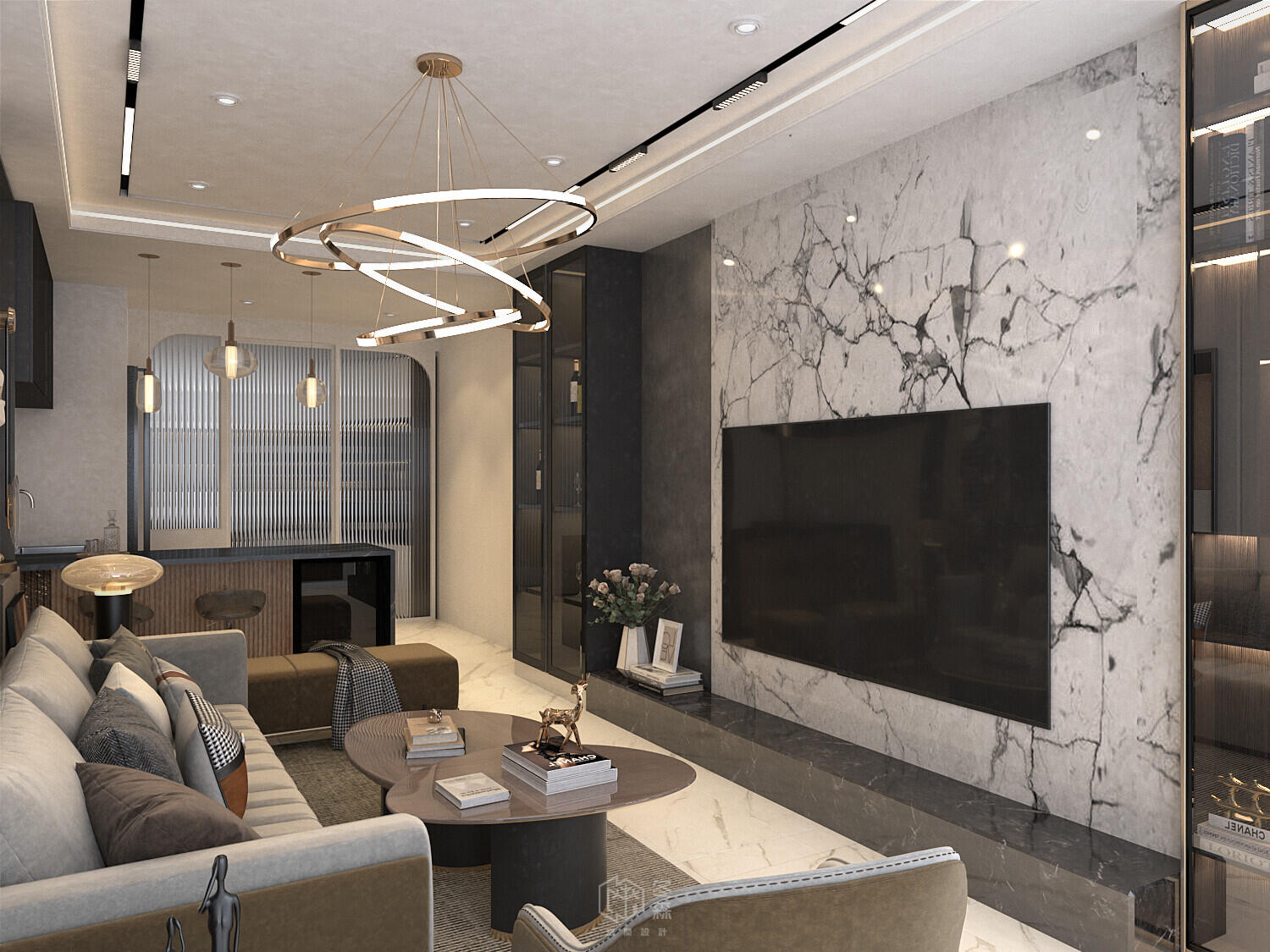 整體以含蓄的木質材,堆疊起溫柔的大地色彩,融合天然石材、鍍鈦金屬與線板等設計元素後,創造輕奢時尚的現代感,卻不失悠閒放鬆的調性。