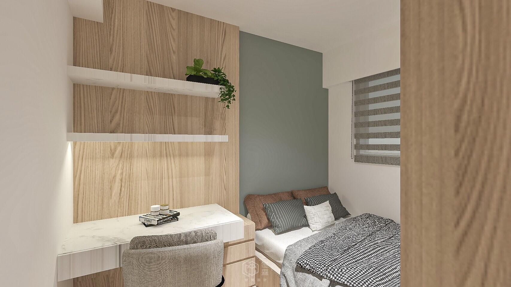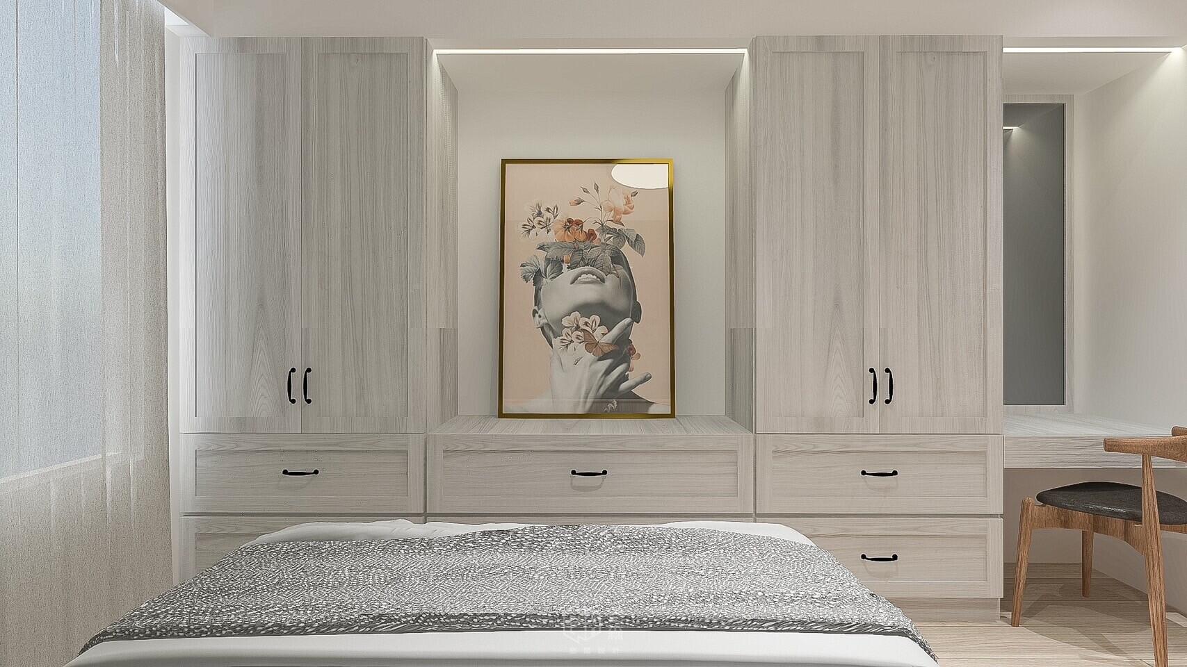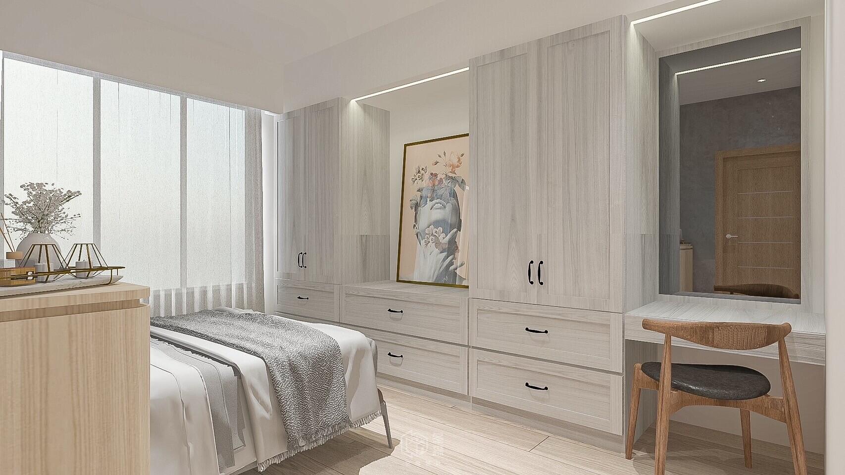 私領域根據每位居者需求量身訂製,主臥室利用純白色與和木質調為基底,交織溫潤柔和的私領域氛圍;沿著壁面置入完善的收納機能,並串連梳妝台與收納平台等機能。次臥空間以綠色調設定,利用簡約手法,巧搭木作櫃體,創造兼具美感與機能的睡眠空間。