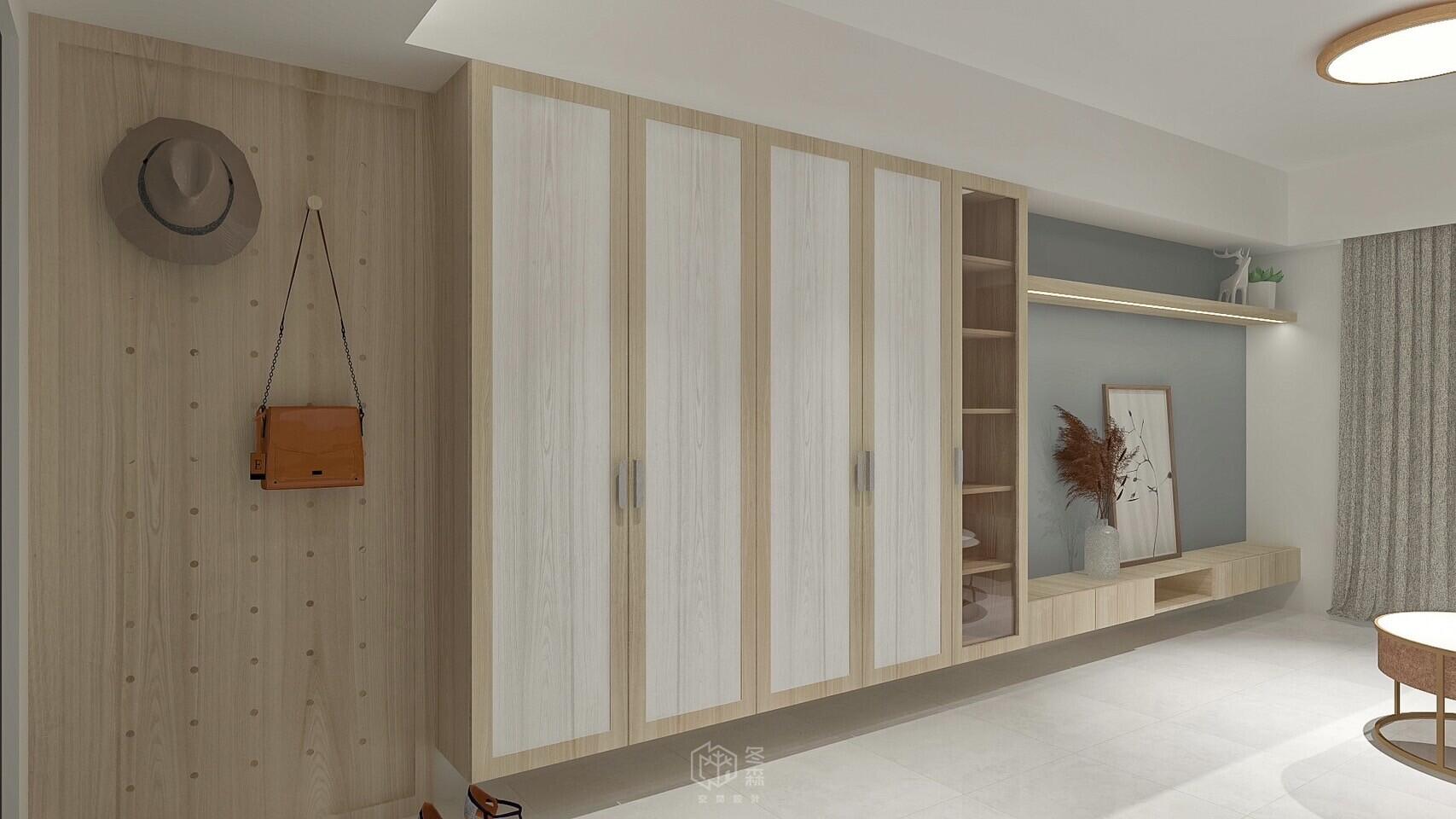 入室玄關側邊搭配洞洞板設計,創造外套衣物的吊掛區,梳理流暢動線,並以一體成形的整合設計增添收納機能,而下方懸浮作為暫置鞋區。