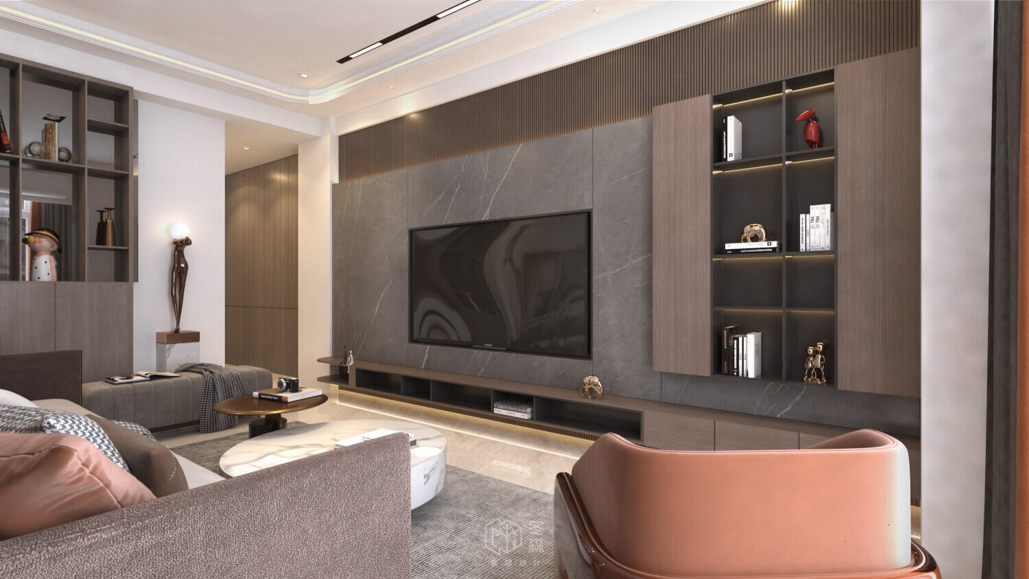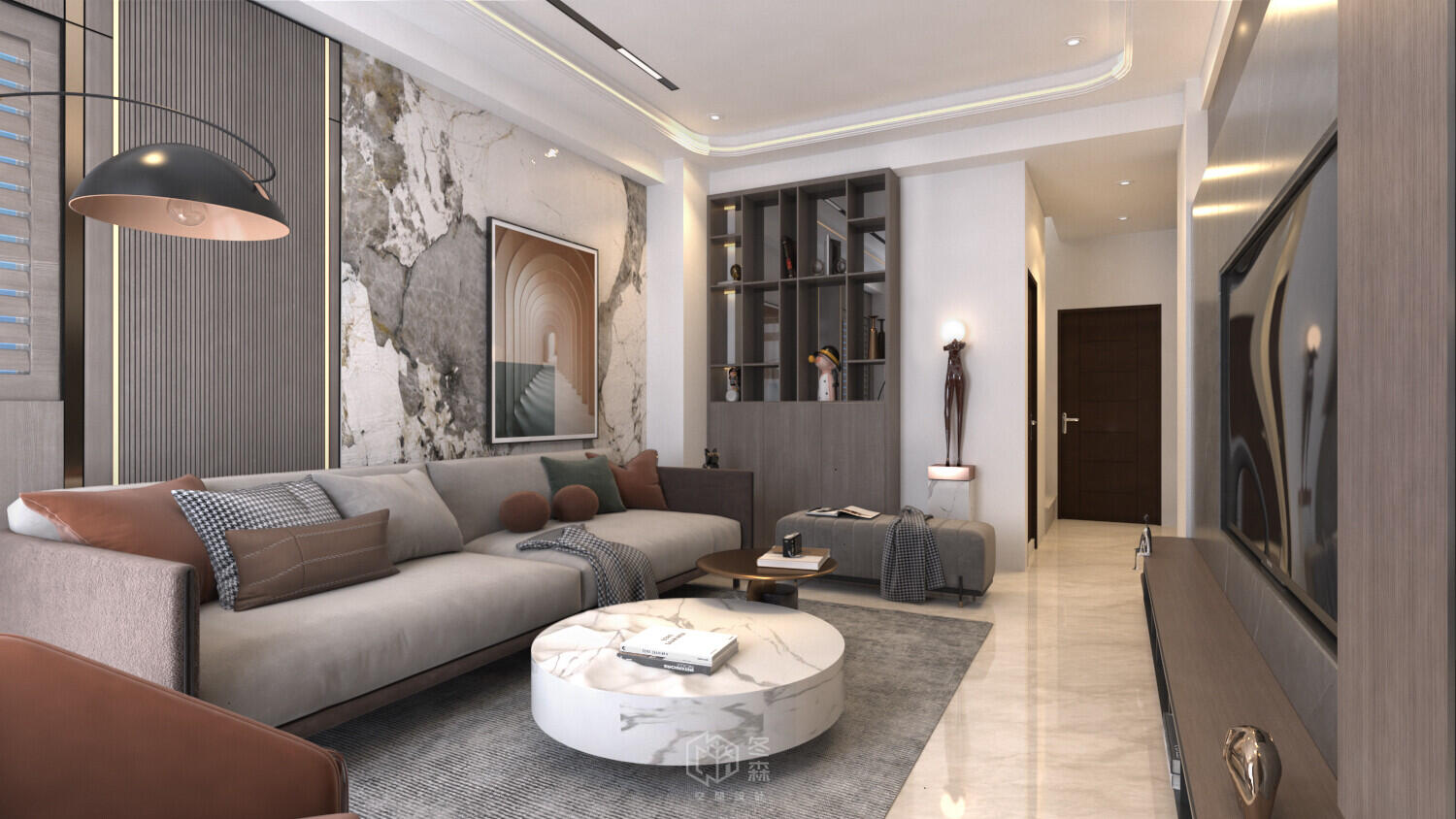 本案為夫妻二人住所,屋主鍾情於輕奢雅致的人文氛圍,設計團隊以大地色調作為基底,局部搭配灰、白調,形塑含蓄內斂的空間格調,同時利用純粹的材料質地,塑造簡潔有力的視覺畫面,完美襯托場域的豐富層次,為空間增添一抹人文風蘊。