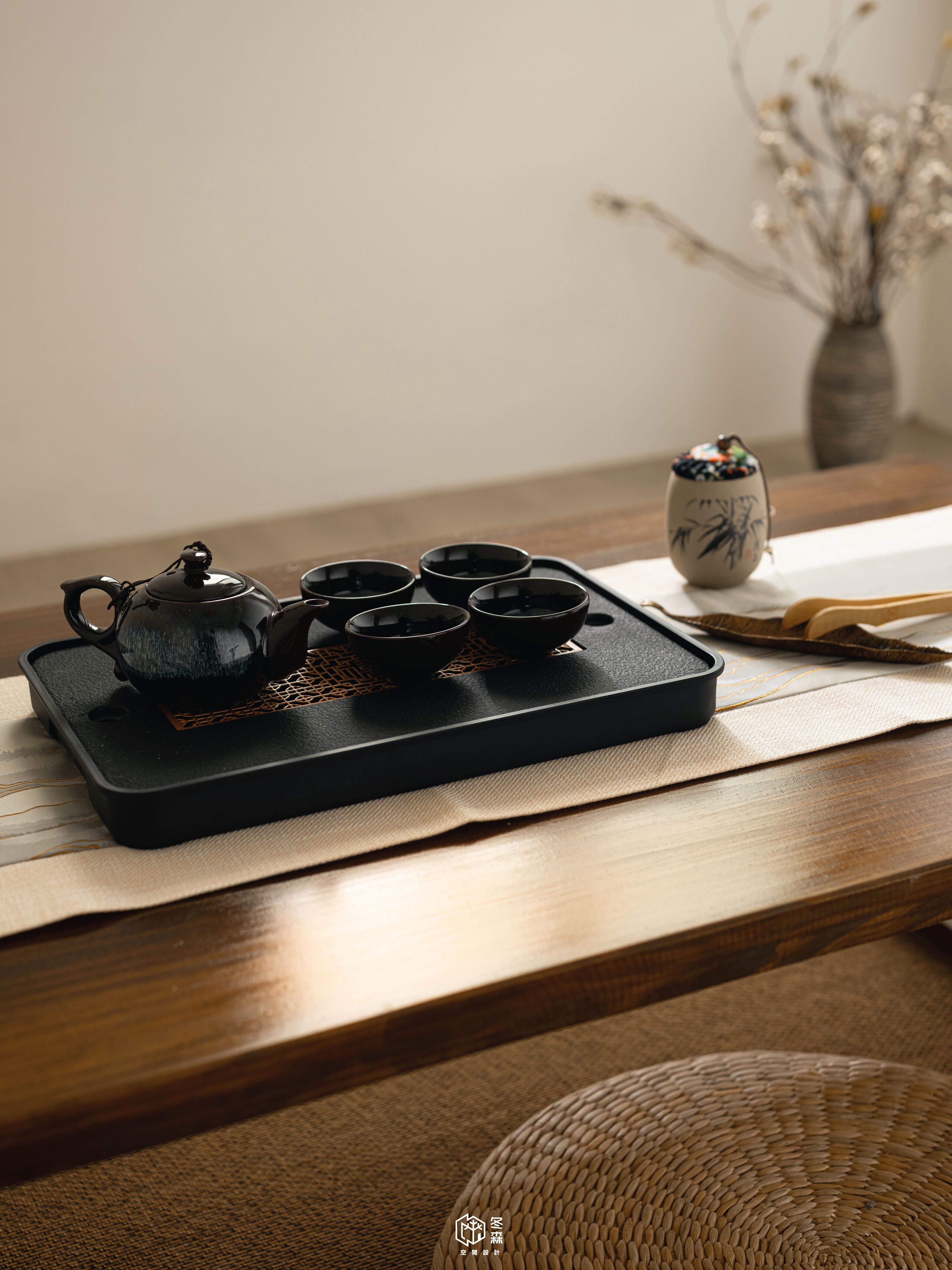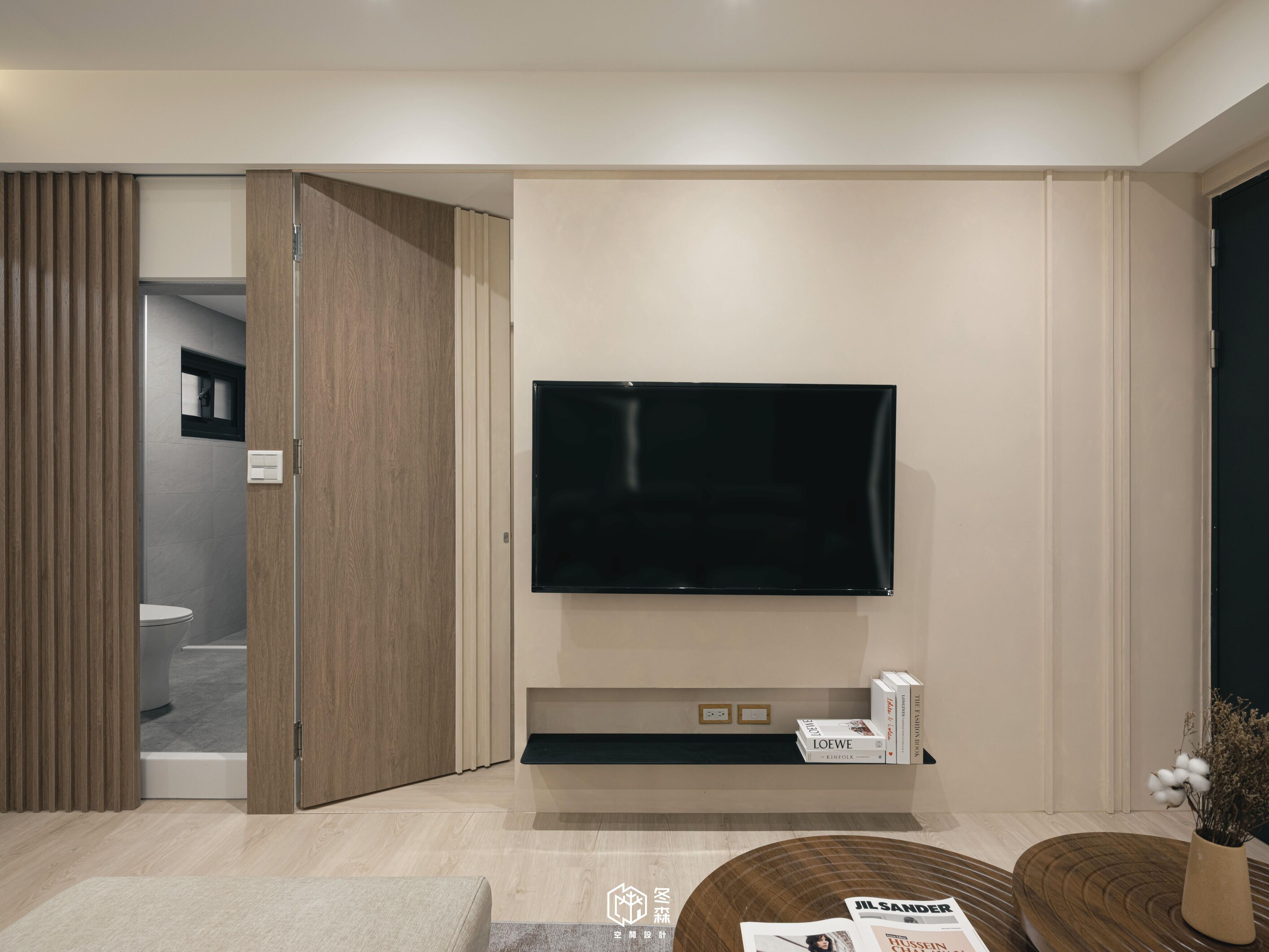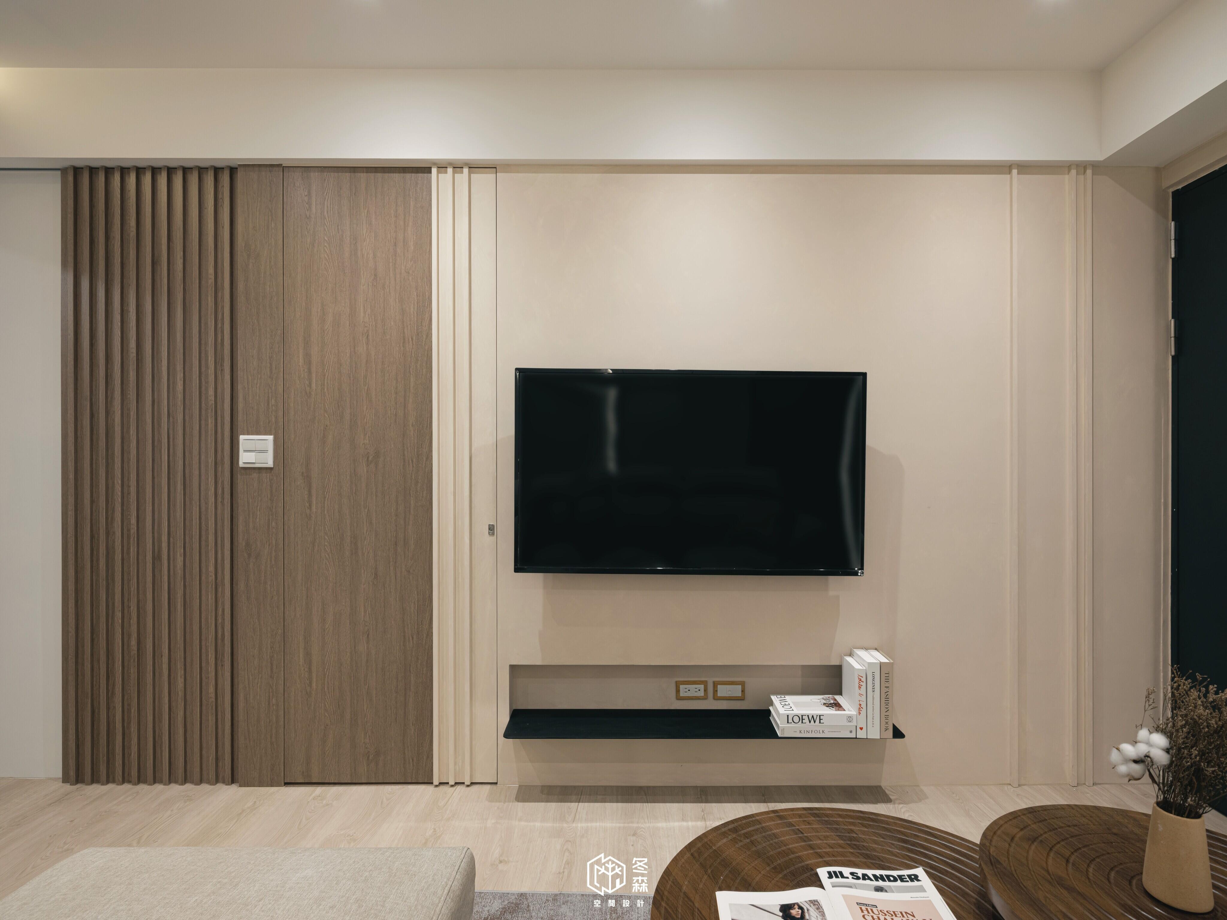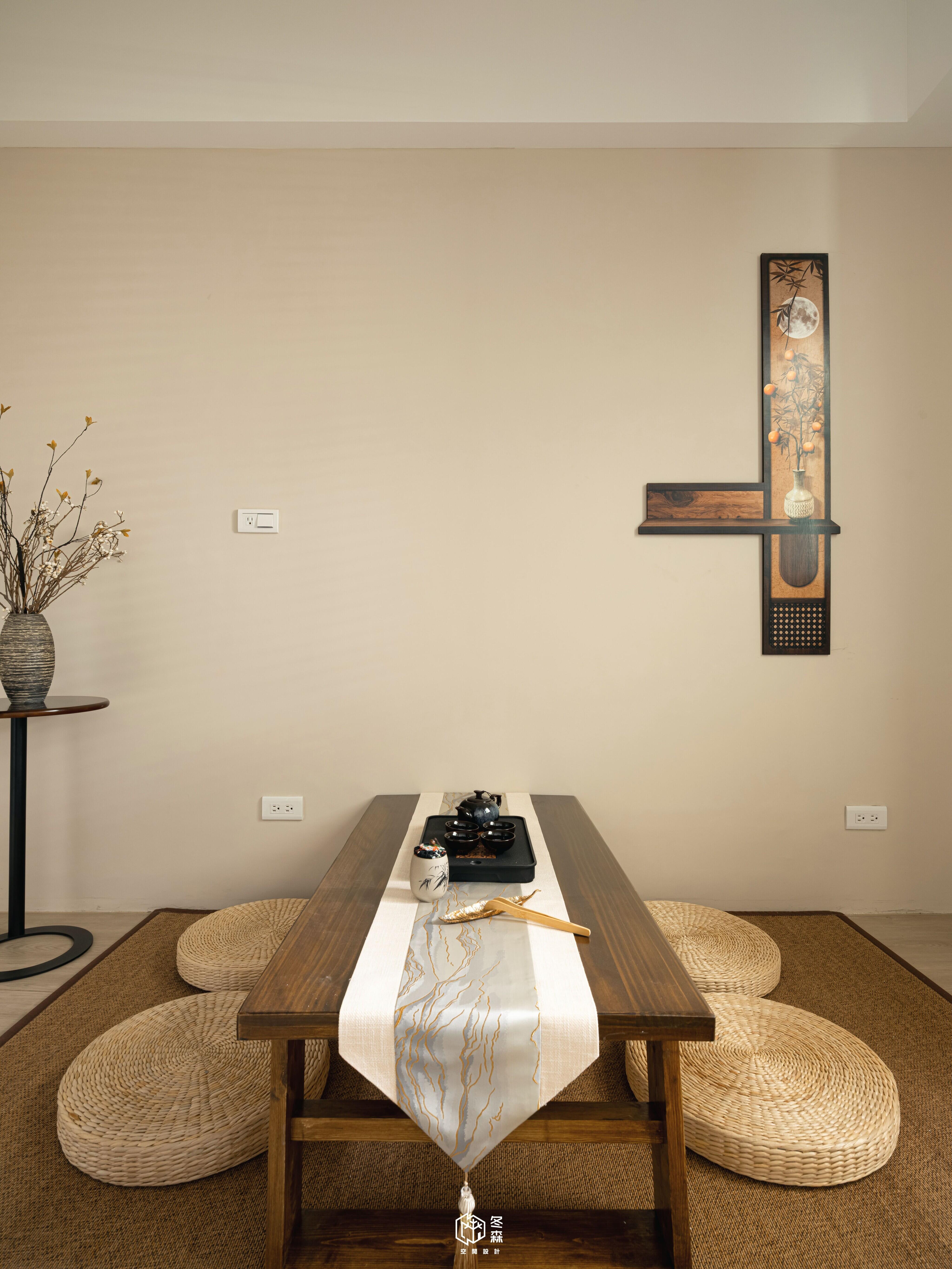 我們將茶室隱藏在電視牆後,男主人偏愛日式元素,因此整體空間會局部以格柵點綴,特地選用木百業及竹編燈具,搭配男主人選購的茶几暈染出濃濃的日式元素