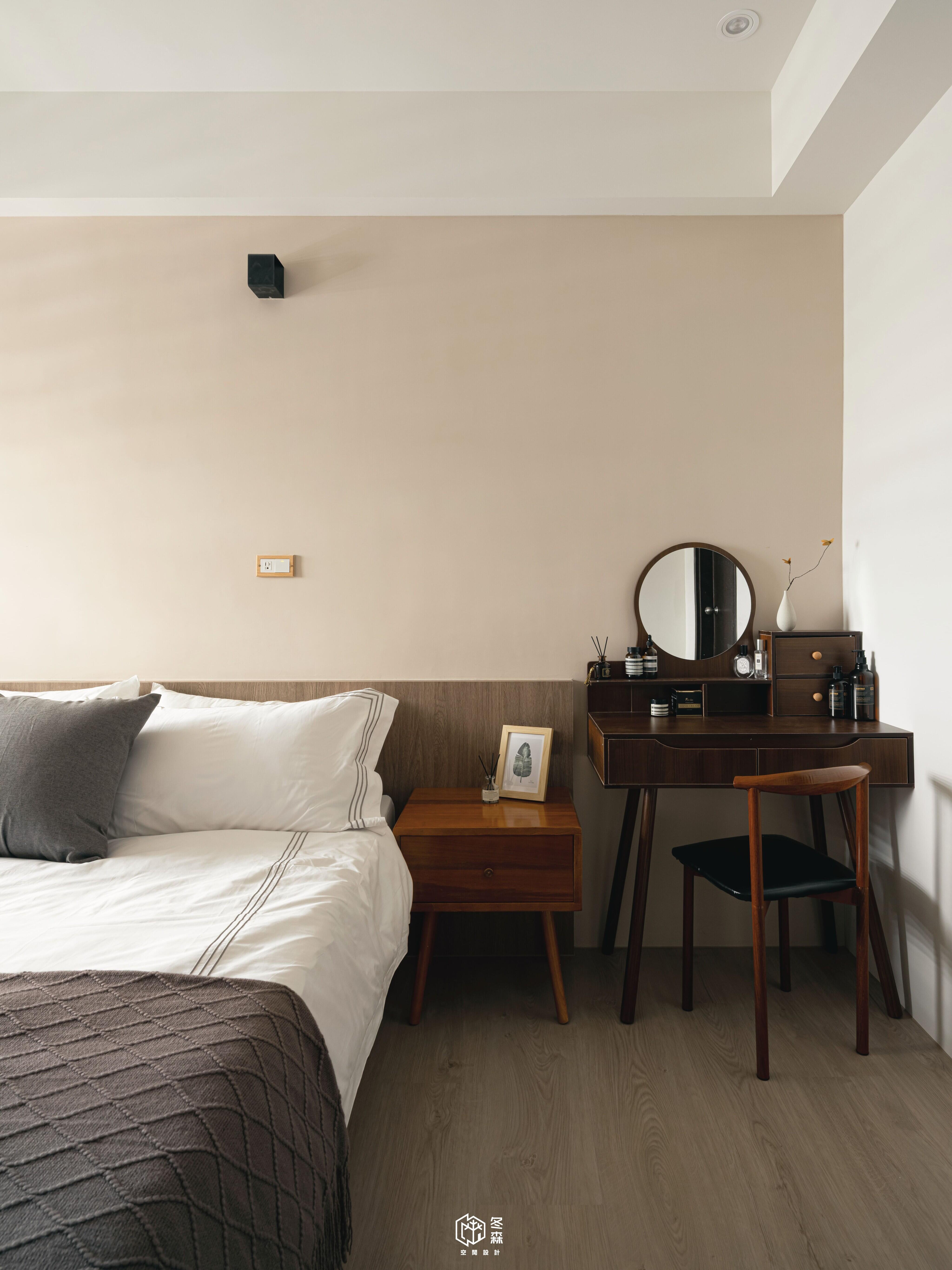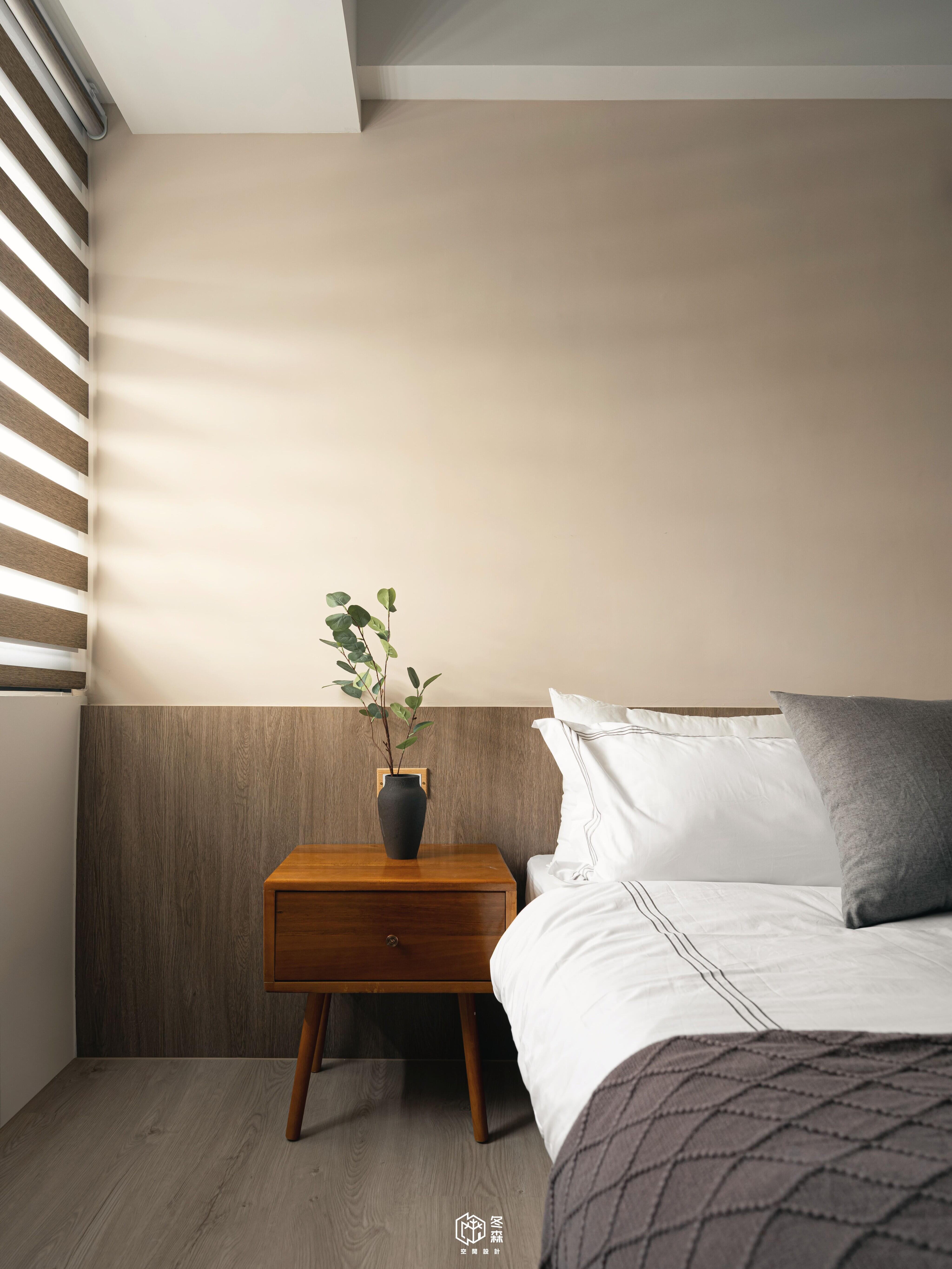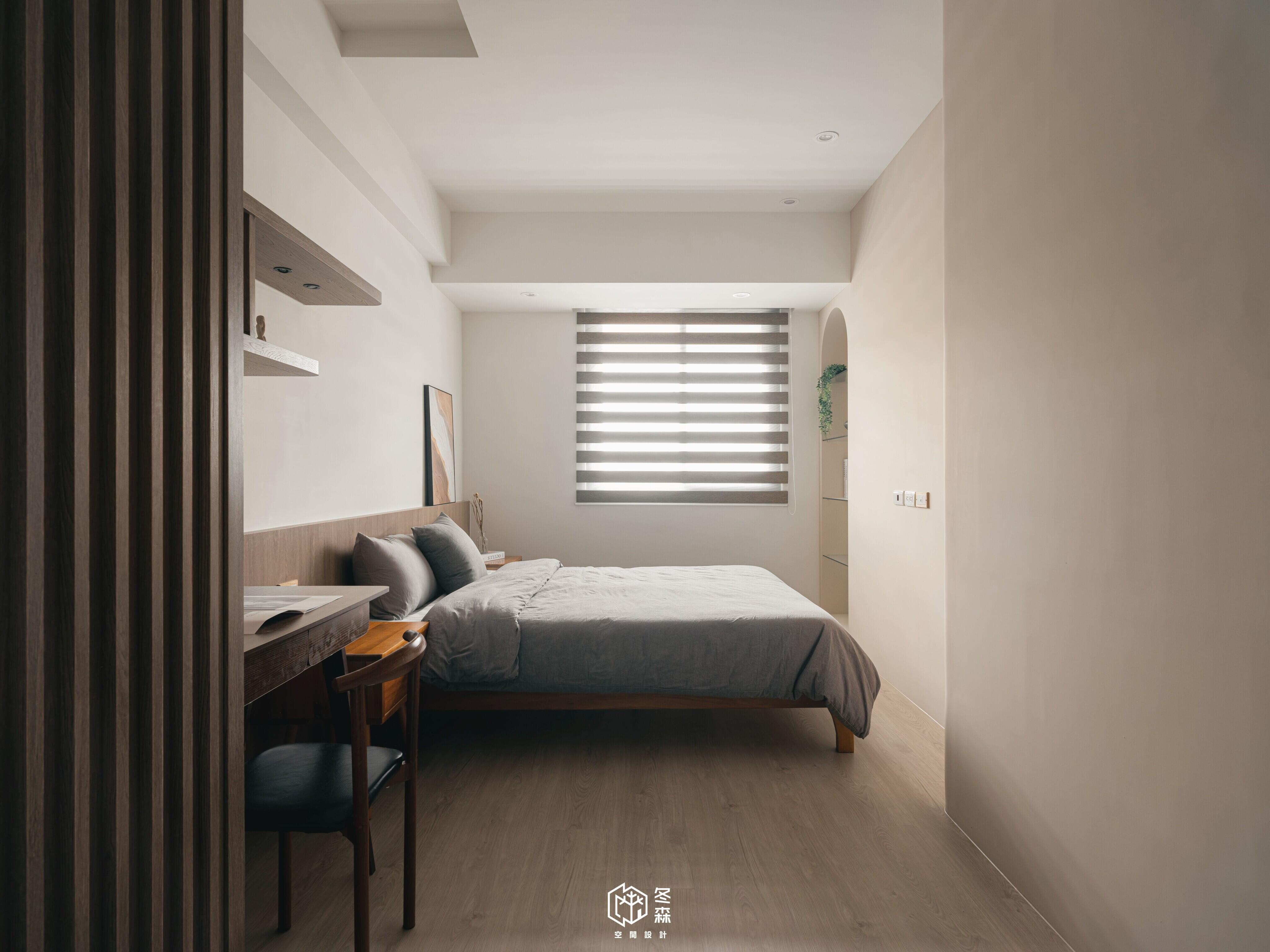主臥及次臥一同使用木作結合格柵門片設計,使視覺感相對開闊,搭配深色木皮與溫潤色調,營造出靜謐沉穩的休憩氛圍。