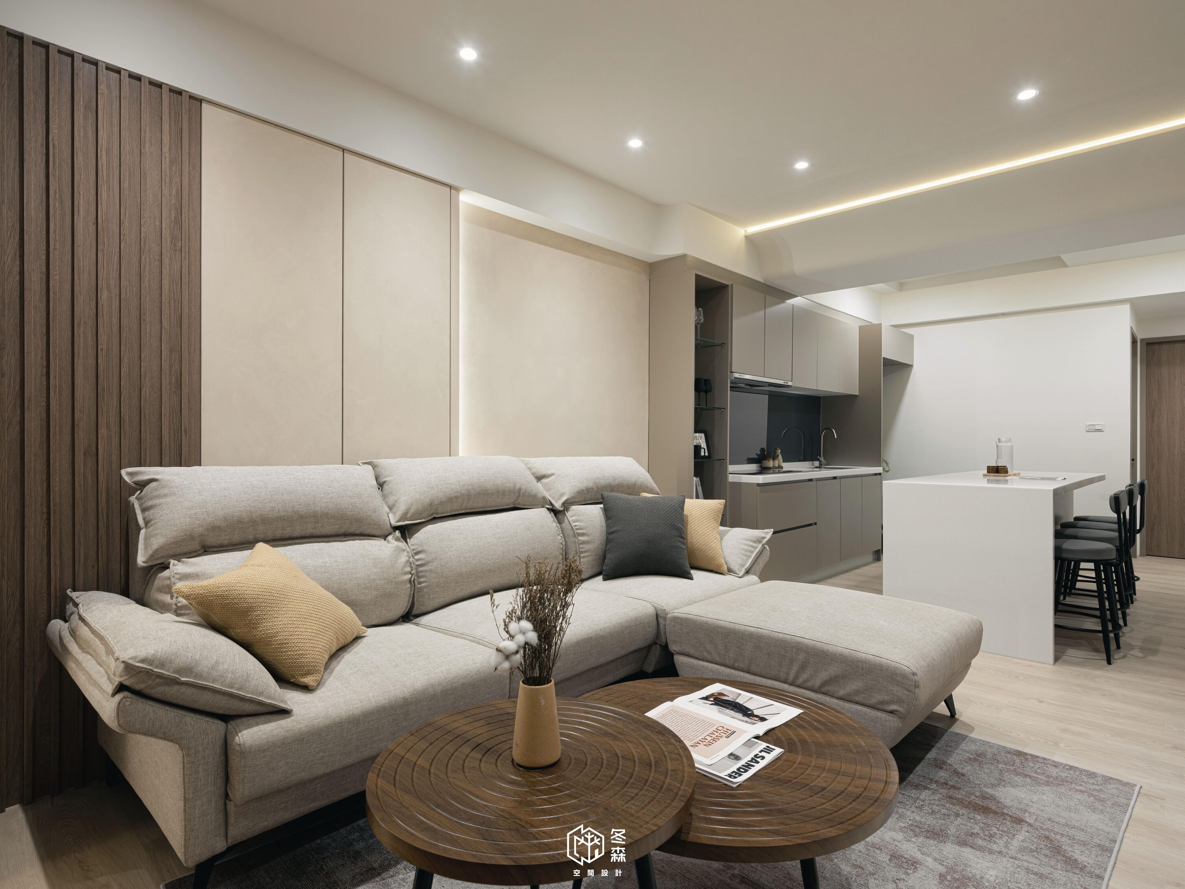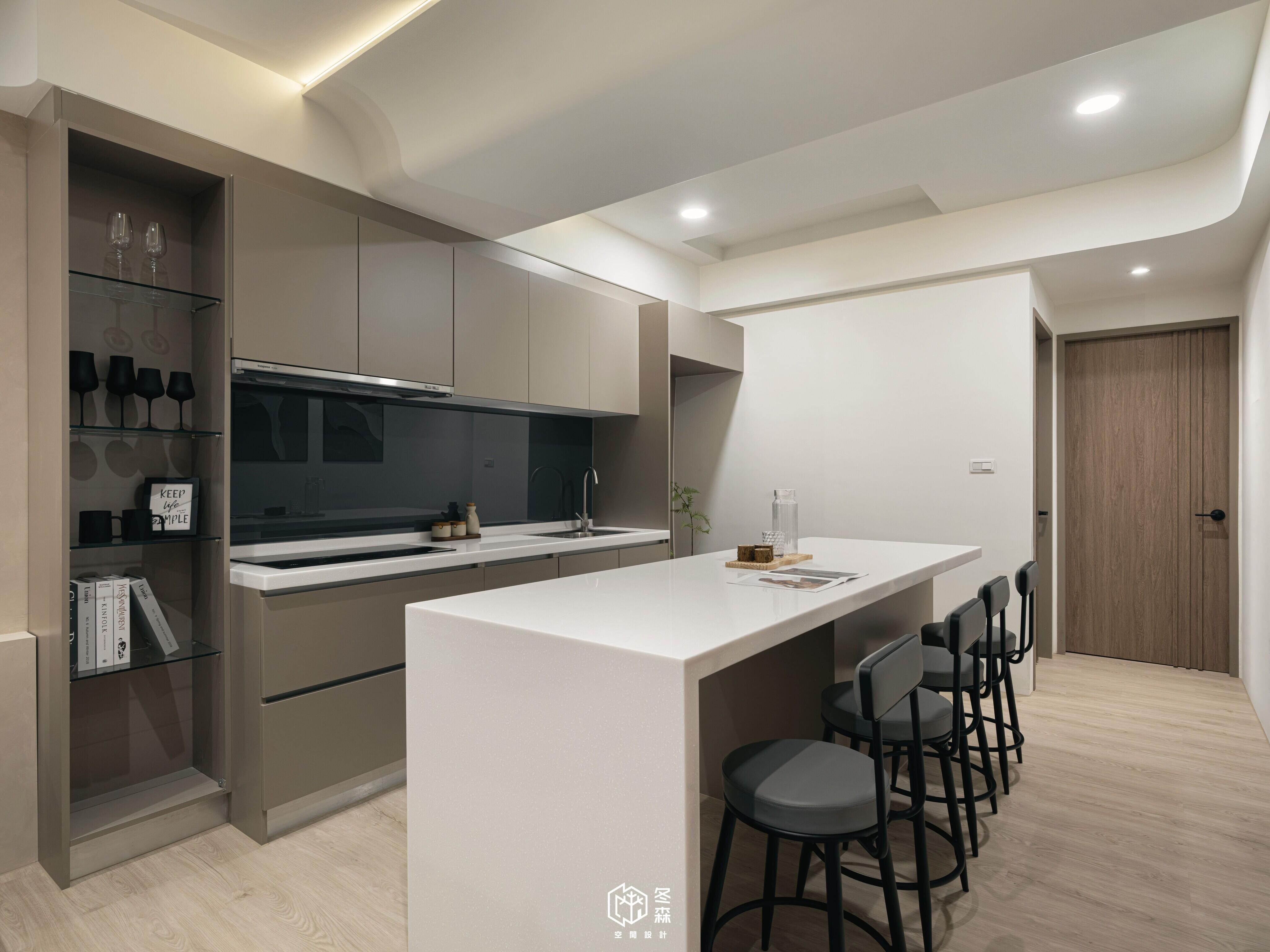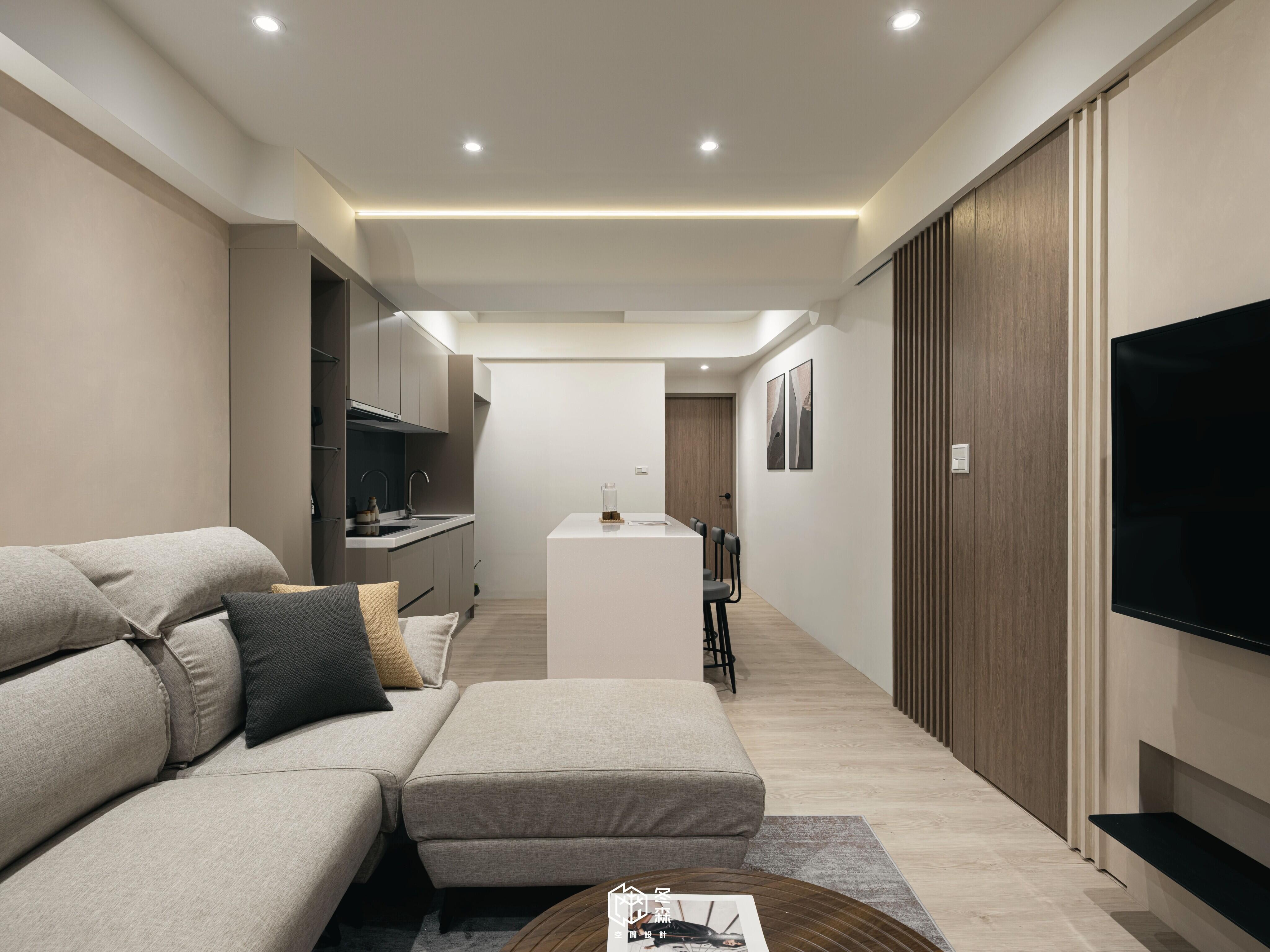 屋主嚮往格局上的開闊感,因此我們拆除廚房與客廳之間的隔間牆,並設立一座純白色寬敞的吧檯,整體色調以協調柔和的奶茶色為主軸,使空間在開闊的同時也能增加其實用性。
